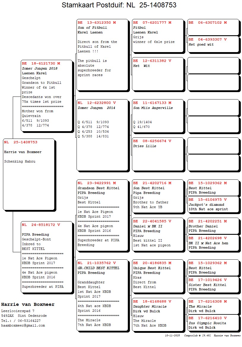Bon 38: Harrie van Boxmeer. (NL) schenkt jonge duif 2025 (zie pedigree) uit beste van Karel Laenen x PIPA Breeding