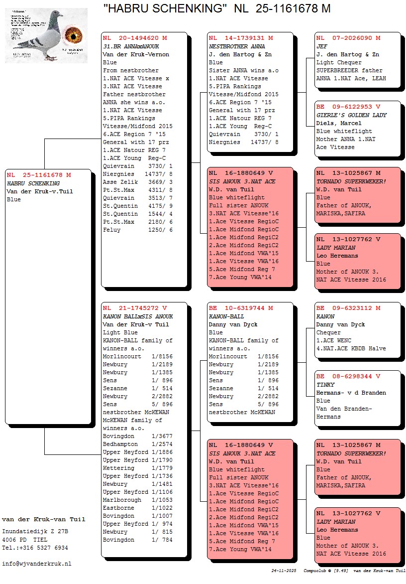 Bon 66: Maurice van der Kruk. (NL) schenkt jonge duif 2025 (zie pedigree) inteelt naar 3e asduif ‘Anouk’