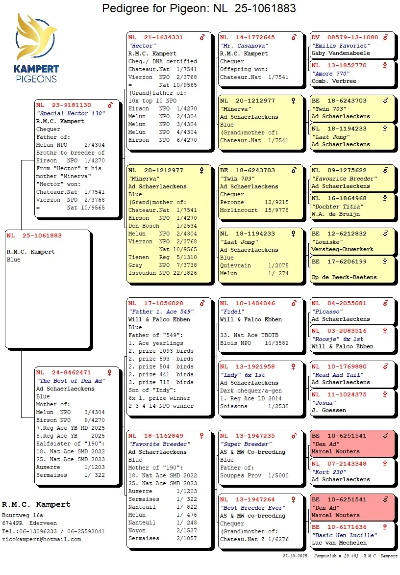 Bon 78: Rico Kampert. (NL) schenkt zomerjong 2025 (zie pedigree) uit topzoon ‘Hector’