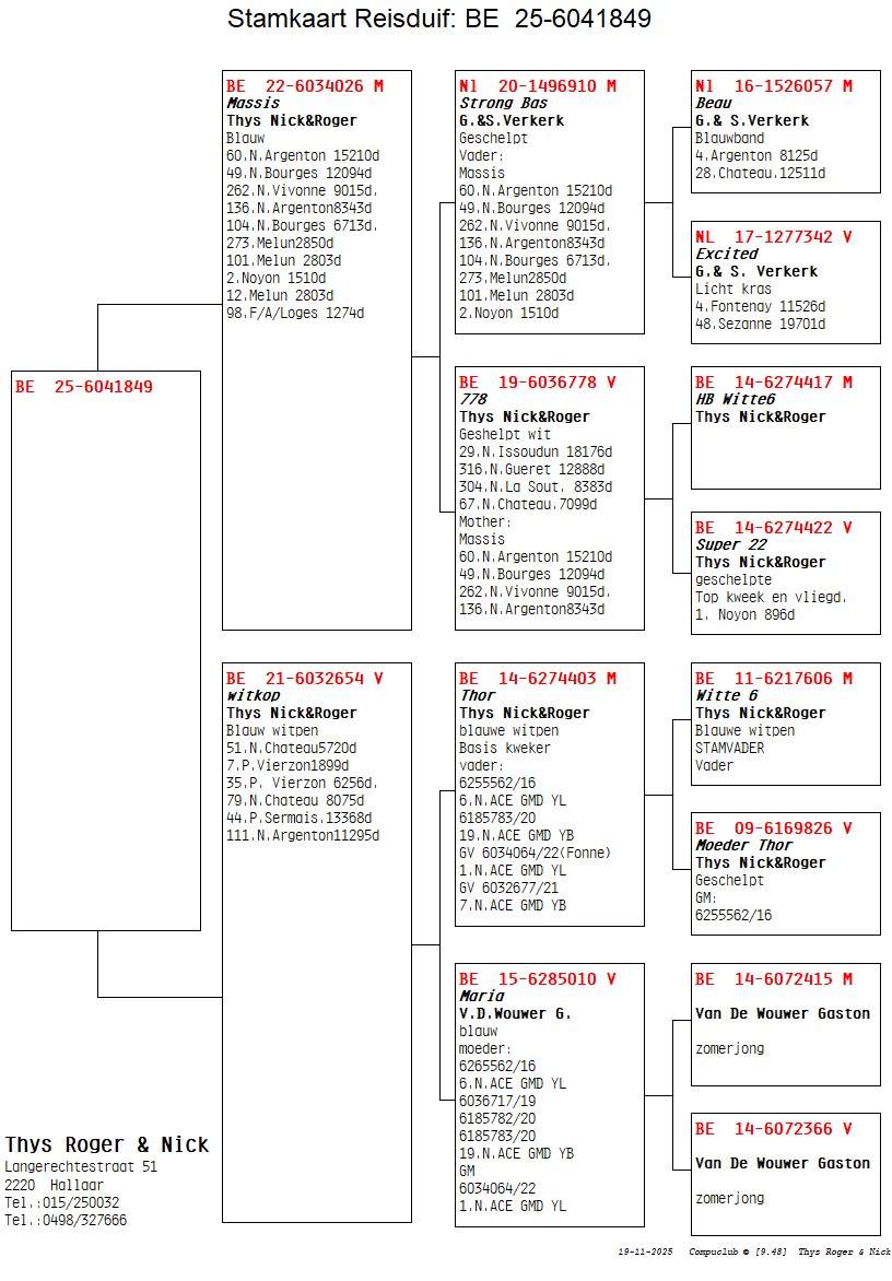 Bon 90: Nick & Roger Thys (BE) schenken jonge duif 2025 (zie pedigree) uit topvliegers ‘Massis’ x ‘Witkop’
