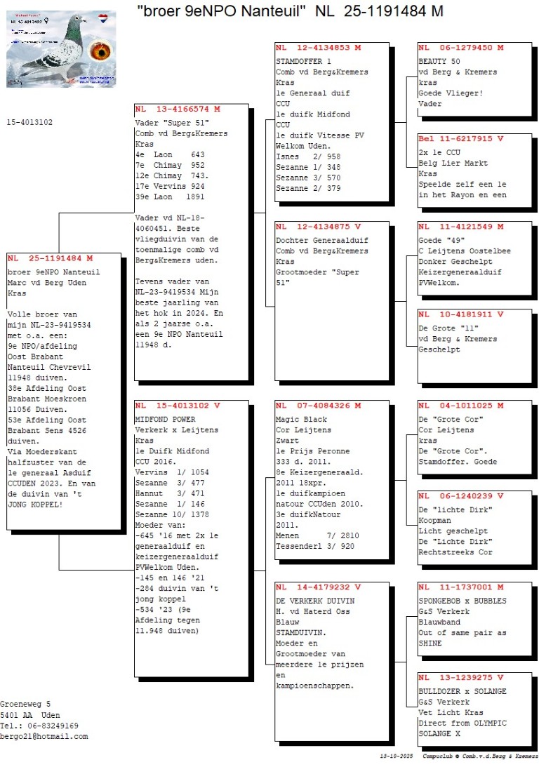 Marc van den Berg uit Uden schenkt een zomerjong (doffer) uit twee van zijn topduiven namelijk “Vader Super 51” en “Midfond Power”. In de afstamming komen we diverse keren de naam Leijtens en Verkerk tegen, maar wat misschien belangrijker is: het gaat om duiven die bewezen hebben zowel goed te vliegen als te kweken!