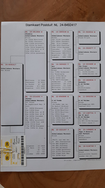 Moeder is volle zus van 303 1e Asduif Midfond Rayon4 ( 9e B2000) en de stamboom staat vol met prestatieduiven!