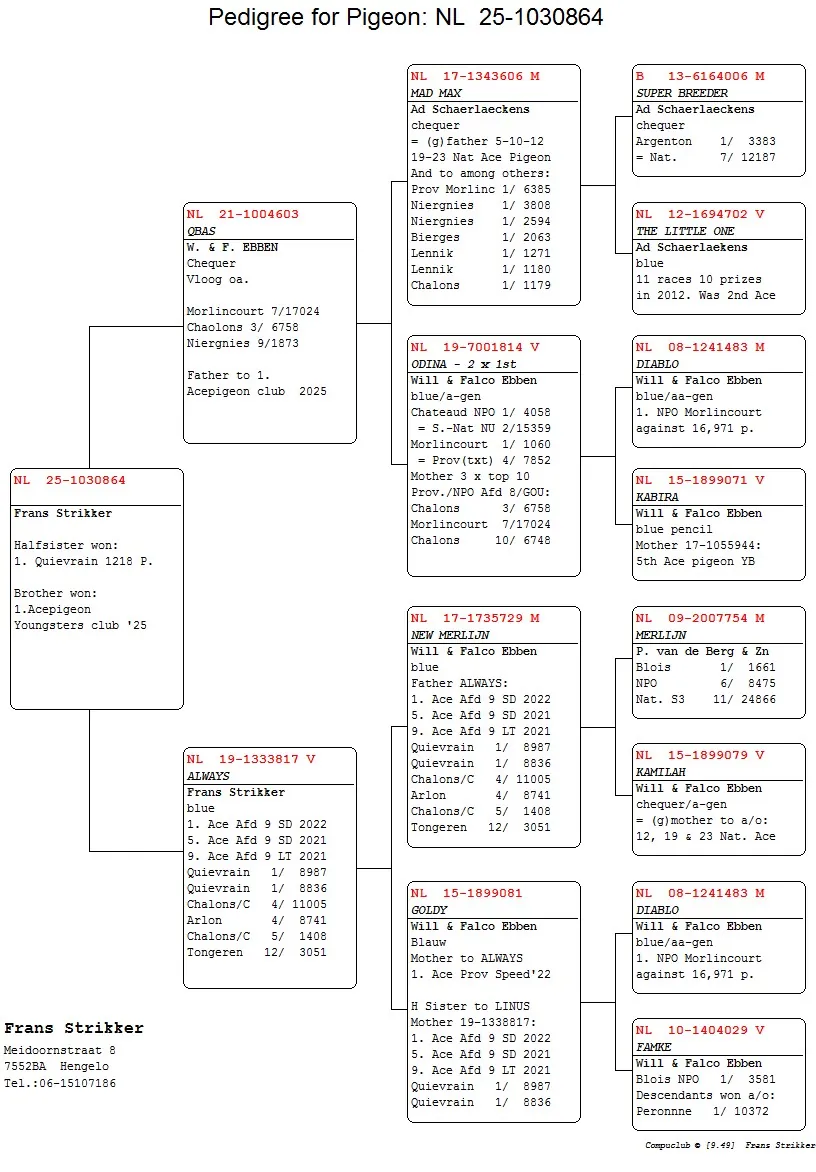 De vader is “QBas”, een rechtstreekse Falco Ebben-doffer uit Mad Max (topkweker) x Odina (1e NPO) en zelf goed voor meerdere top 10-noteringen in groot verband. Always en Qbas zijn dit jaar samen ouders van de 1e asduif van de club, een kansrijke versterking voor wie echte prestatielijnen zoekt.