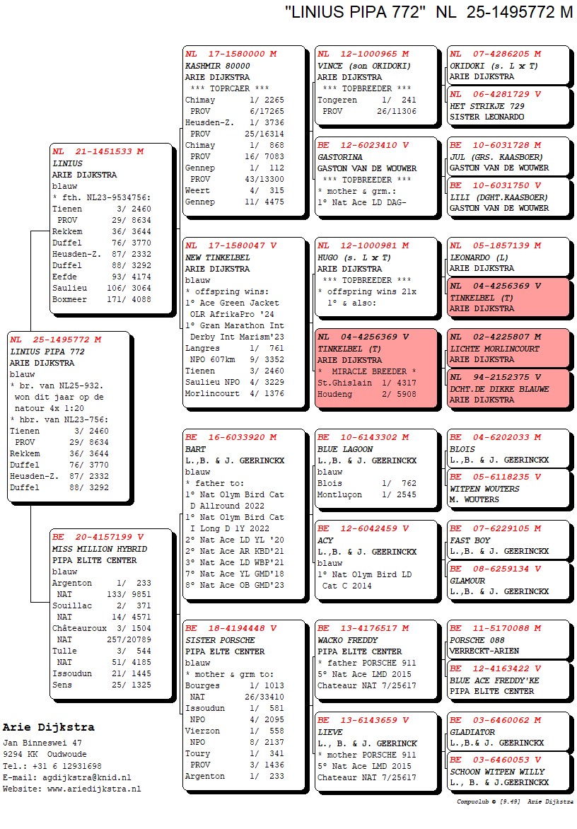 Arie voorstellen is hetzelfde als een open deur intrappen. Al jaren speelt hij op nationaal topniveau. Eerst samen met zijn vader Enne en later alleen op eigen naam. De nazaten van het top koppel Leonardo x Tinkelbell maakte hem wereldberoemd. In 2024 wist hij weer langs de hoogste toppen te scheren met zijn top duivin Felice, die 1e nationaal duifkampioen fond werd. Ook in 2025 weer een hele rij aan kampioenschappen, met wellicht als mooiste een 2e hok onaangewezen dagfond noordelijke unie (afd 7 tm 11). Arie schenkt ons een zomerjong 2025 uit Linius x miss million hybrid.