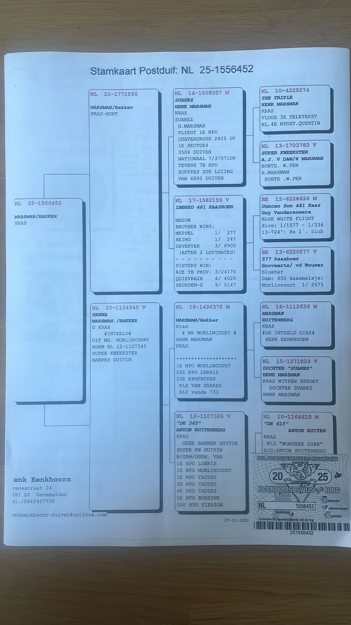 Kweekcentrum Henk Eenkhoorn schenkt ons een laat jong 2025. Onder andere Henk Marsman te Zwartsluis put jaarlijks uit de bron van Henk Eenkhoorn. De prestaties van Marsman zijn ongeëvenaard, mede door de inbreng van Eenkhoorn. De oude lijnen van Anton Ruitenberg en de toplijn van Suarez van Henk Marsman lopen als een rode draad door de kolonie Eenkhoorn. De aangeboden jonge duif is een kleinkind van de reeds vermelde Suarez. Die winst o.a. een 1e sector 4 op Chateauroux te winnen en tevens een 7e van geheel Nederland tegen dik 37.000 duiven, met een aanzienlijke overvlucht. Voor wie dit pareltje?