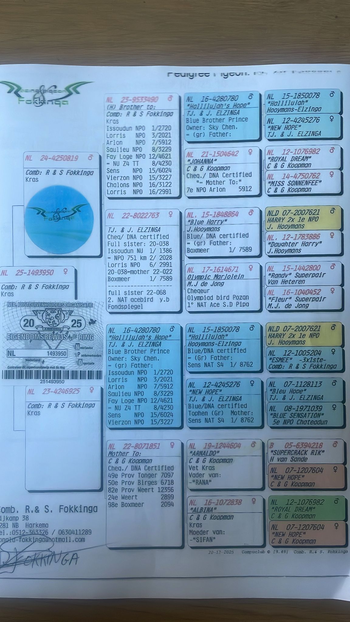 Vader Sietse en zoon Ronald zijn landelijk bekende liefhebbers en specialisten op de eendaagse Fond. In 2021 hadden ze de 1e Nat. Asduif NPO op de Eendaagse Fond met hun “Nationaal Pogacar”. Een crack met wiens jongen andere topmelkers buitengewoon geslaagd zijn overigens. Een kleinkind van “Nationaal Pogacar” won voor Gerard Koopman de eindrace van de Pattaya One Loft Race in 2025 en “Pogacar Junior” is een superkweker bij Johan de Vries IJsselmuiden. En over cracks gesproken: over 2022 en 2023 hadden ze opnieuw een fantastische vliegster onder de pannen met “Olympic Vollering”: 2e Olympiadeduif Nederland Eendaagse Fond Maastricht met zes knalvroege prijzen. Verder commentaar eigenlijk overbodig. Toch gaan we nog even verder want in 2025 lieten ze zien over een allround topkolonie te beschikken door 1e Generaal kampioen Onaangewezen te worden in samenspel de Eenheid. Met de jonge duiven wonnen ze bovendien een 1e NPO Marche 4799 d. (met een kleinkind van “Pogacar”). En de mooiste uitslag met de oude duiven willen we hier beslist vermelden omdat het een echt pareltje is: 1, 2, 5, 6, 8 Hirson 17.548 d. tegen alles en iedereen in afd. 11 Friesland ‘96.