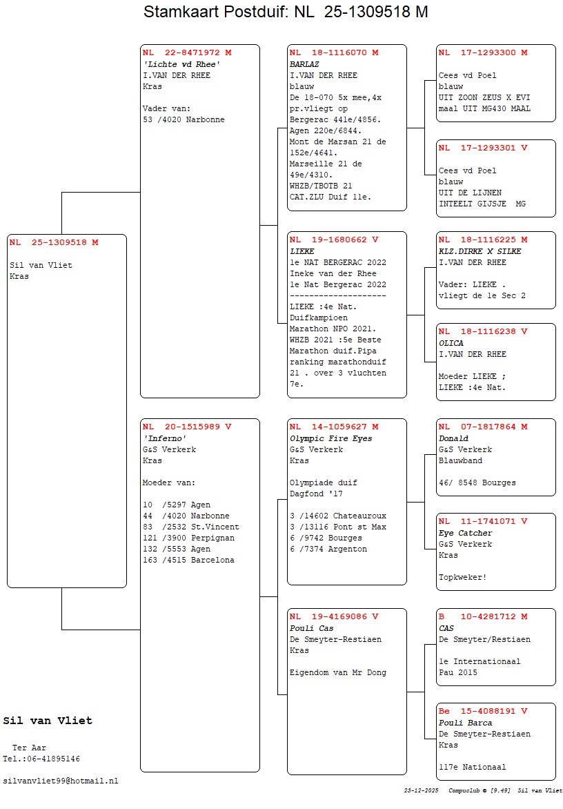 De Keizer Kampioen van 2024 van de FondUnie 2000 schenkt een jong uit zijn goede vliegers. Sil heeft geweldige seizoenen achter elkaar gehad op de marathonvluchten met een ochtendlossing. Met als hoogtepunt de 1e NATIONAAL BARCELONA 2024. In 2024 werd hij seizoenbreed KEIZER KAMPIOEN bij onze sterke competitie van de FONDUNIE 2000. Hij won de laatste seizoenen vier vluchten in de Fondunie 2000 en veel kopprijzen in zijn eerste vier jaren op de marathonvluchten met een ochtendlossing. De basis van zijn stam komt van wijlen Ben van Kempen. Deze duiven komen o.a. van Hans Knetsch, Jan Lases en Schreurs. We zien ook goede kwekers terug van Tim Hage, vader en zoon Verkerk en twee goede kwekers van Jac. van den Bosch (uit zijn 1e Nationaal Bordeaux).Wie gaat er vandoor met dit toppertje van Sil?