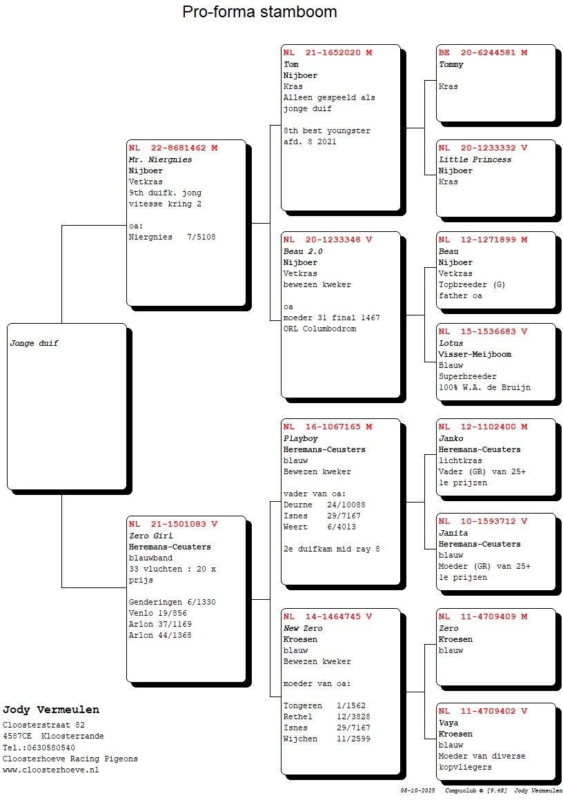 Kijk eens naar de afstamming van deze prachtige late jonge duif. Wie neemt dit potentiële goudhaantje mee naar huis?