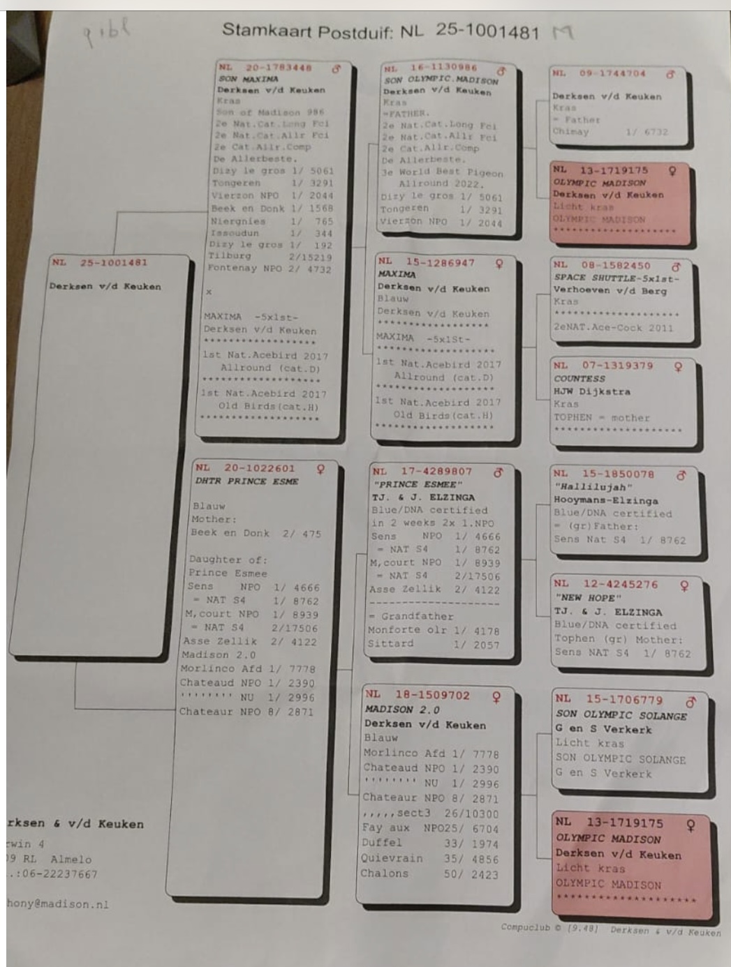 De schenking is de jonge duif 25-1001481 uit Son Maxima (5x 1ste, 1e Nationale asduif 2017 Allround.