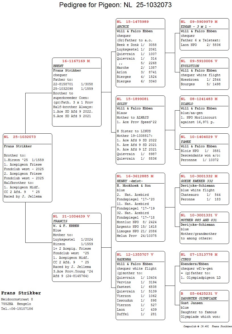 Met weinig duiven hard spelen’, dat was de gedachte toen Frans Strikker in 2015 herstartte met postduiven. In eerste aanleg kwamen er enkele duiven van goed spelende liefhebbers uit zijn club, later in het jaar kwamen daar drie duiven bij van Will en Falco Ebben uit Boven-Leeuwen. Frans koos voor hen omdat ze met weinig duiven erg goed presteerden en met de gedachte dat hierdoor de kans op bruikbare jongen toe zou nemen. Het bleek een schot in de roos met onder andere de top duiven: