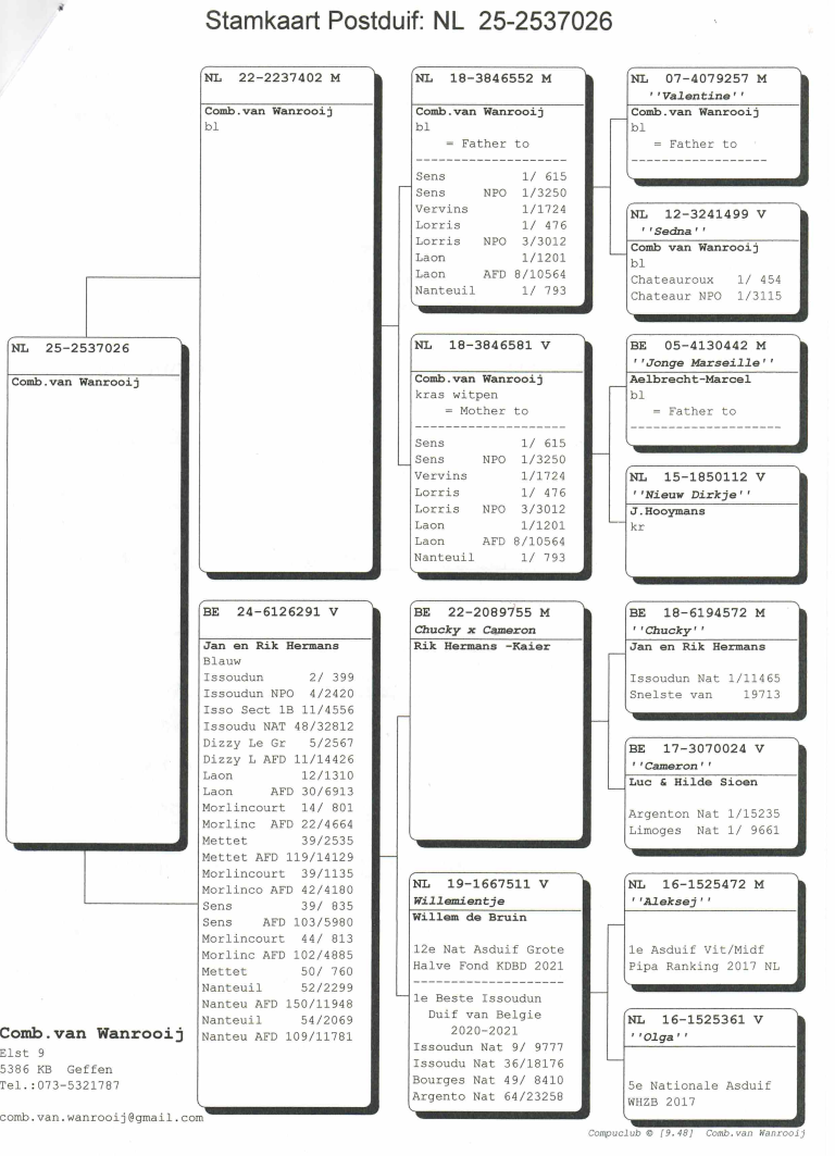 In haar afstamming vinden super duiven zoals Chucky (1e nat. Issoudun Rik Hermans), Cameron (2x 1e Nat. Sioen) en Willemientje (direct Willem de Bruijn)