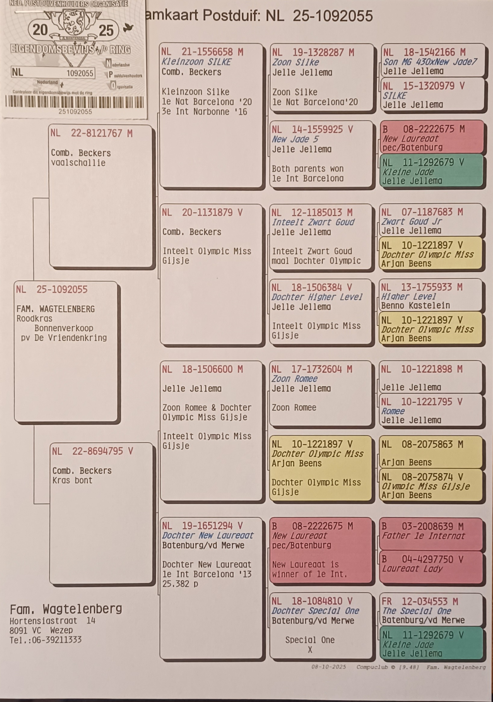 Hierop werden ze dit jaar in hun Inkorfcentrum 1e Kampioen bij de speciaal hiervoor uitgereikte ringen en 1e Keizerkampioen overall. Fam. Wagtelenberg stelt een laat jong 2025 beschikbaar. Zie de stamboom.