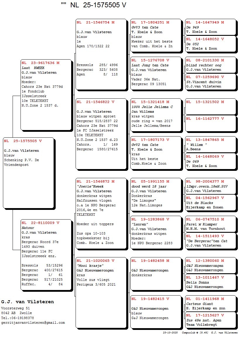 Gerrit van Vilsteren uit Zwolle is een van de beste fondspelers uit het noorden van Nederland. De duiven van de kampioen uit Zwolle vliegen al jaren top op een van de verdere afstanden in de afdeling en sector. Stuntuitslagen worden behaald op de marathonraces, met vele titels op zowel afdelingsniveau als Nationaal niveau tot gevolg. Vele andere liefhebber slaagden ook wonderwel met Van Vilsteren duiven … het toppunt was wellicht Internationaal Barcelona 2024, waarop Koele en Zonen 1e-2e-3e Internationaal wonnen en zowel de eerste als de derde prijswinnaar 50% Van Vilsteren duiven zijn. Gerrit zelf blijft een vaste waarde op de zware klassiekers. Zijn geweldige stam fondkleppers blijft in staat om absolute topklasseringen te behalen.