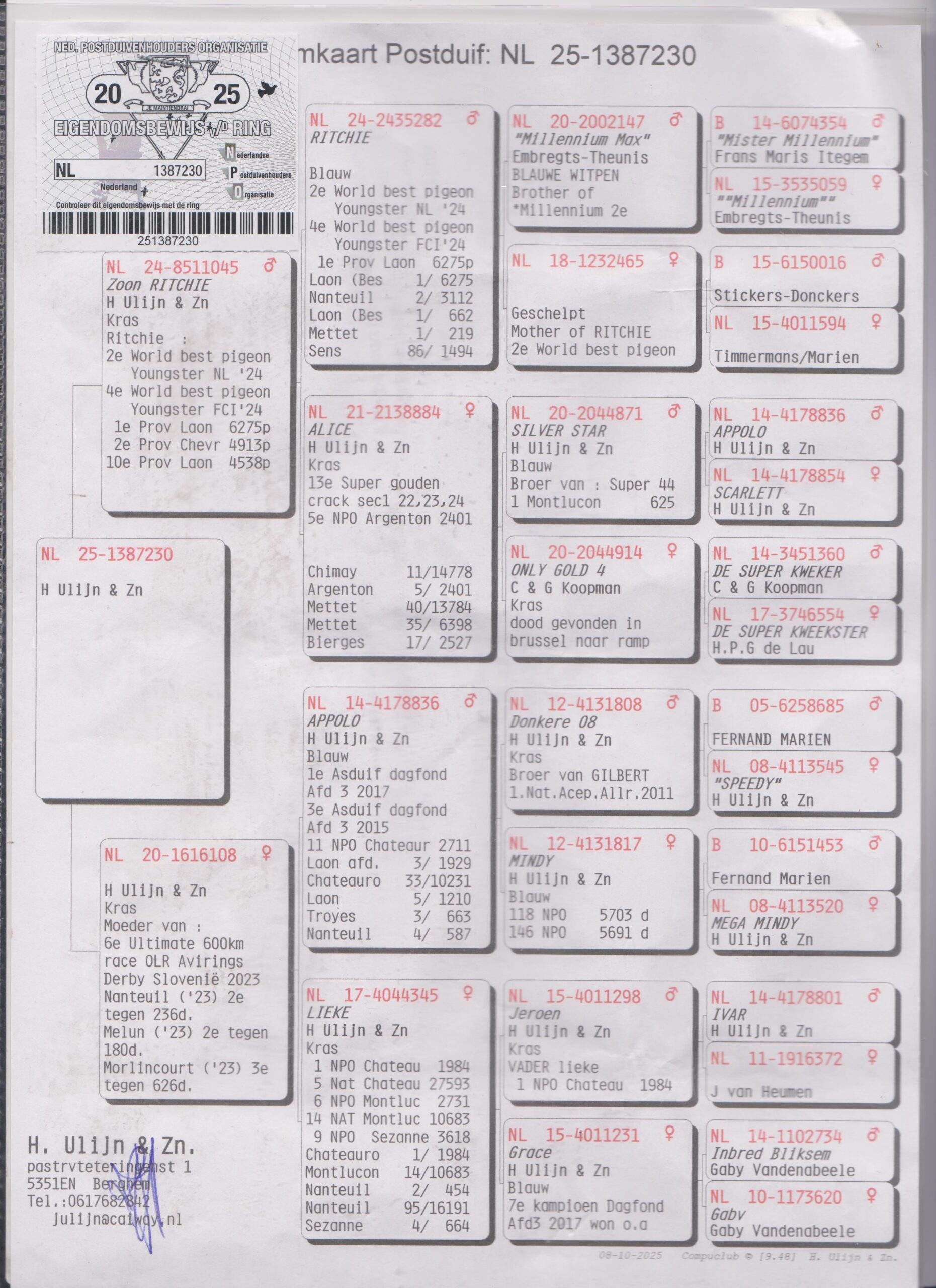 Hier een bon voor een jonge duif van de alom bekende combinatie H.Uliin & Zn, zij behoren tot de sterkste hokken van afdeling Oost-Brabant en heeft de afgelopen jaren Indrukwekkend uitgehaald op zo wel vitesse-midfond als dagfond In de kring Oss e.o. Ze hebben in 2025 wederom vele kampioenschappen behaald in de sterke afdeling 3, dit jaar 2025 o a 4e beste liefhebbers onaangewezen, Vitesse 8e onaangewezen, Midfond 10e onaangewezen. Op de dagfond o.a. 5e duifkampioen, 1e aangewezen, 4e onaangewezen. Ook hebben ze geweldig gevlogen met de jonge duiven en draaide regelmatige kopduiven in het snuitje van de uitslag van de Afdeling. Zij mogen terecht topliefhebbers genoemd worden die topduiven hebben voor vluchten van 100 tot 700 km. Ze schenken een mooi jonkie uit enkel toppers van hun hok.