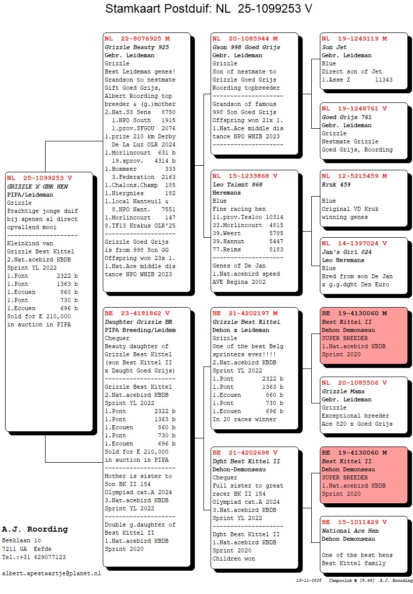Koop 22 Albert Roording, Eefde (NL) schenkt jonge duif 2025 uit dochter van ‘Grizzle Best Kittel’ (zie pedigree)