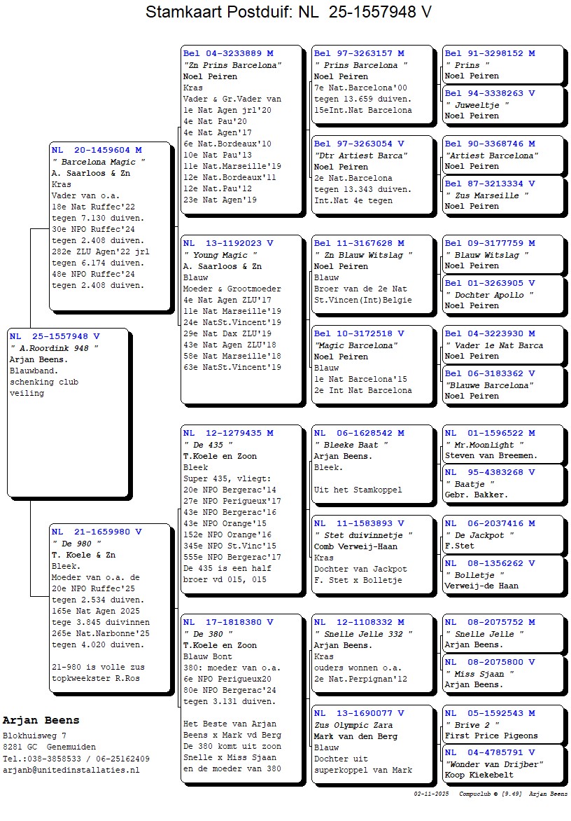 Koop 81 Arjan Beens, Genemuiden (NL) schenkt jonge duif 2025 uit twee klasrijke en bewezen kwekers (zie pedigree)
