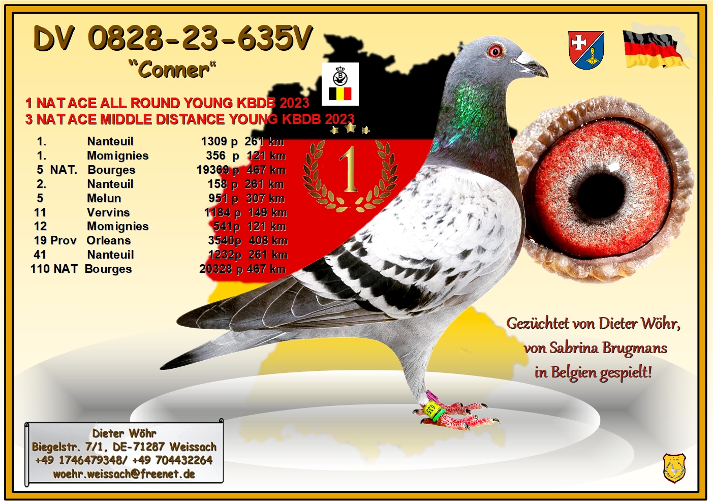 Wederom een bon van onze Oosterburen en wederom van sublieme kwaliteit. Dieter Wöhr schenkt een bon voor een kleinkind ‘Fenomeen’ te kweken in 2026 … ter indicatie; de 1e Nat. asduif KBDB allround voor Sabrina Brugmans werd gekweekt uit een dochter van diezelfde ‘Fenomeen’. En daarmee komen we bij de essentie: Dieter Wöhr is een echte ‘meesterkweker’. Nazaten van zijn duiven blinken vooral uit bij de Belgische topspelers Sabrina Brugmans en Willy Steenarts … sterker nog; rechtstreekse of 50% Wöhr duiven werden al 1e-2e-3e-3-11e-13e en 20e Nationale asduif KBDB!! En wonnen talloze 1e prijzen, veelal tegen flinke concurrentie.