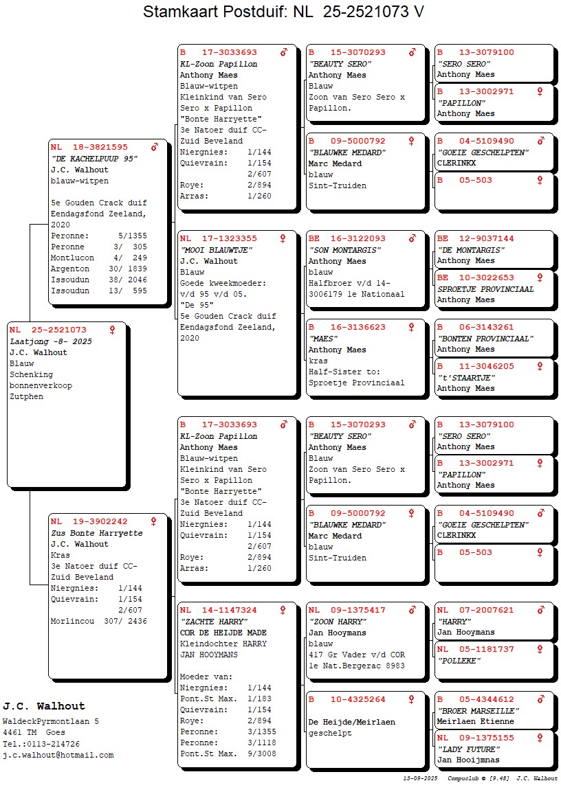 Koop 18 Hans Walhout. Goes (NL) schenkt jonge duif 2025 uit 5e Gouden Crack dagfond 2020 (zie pedigree)
