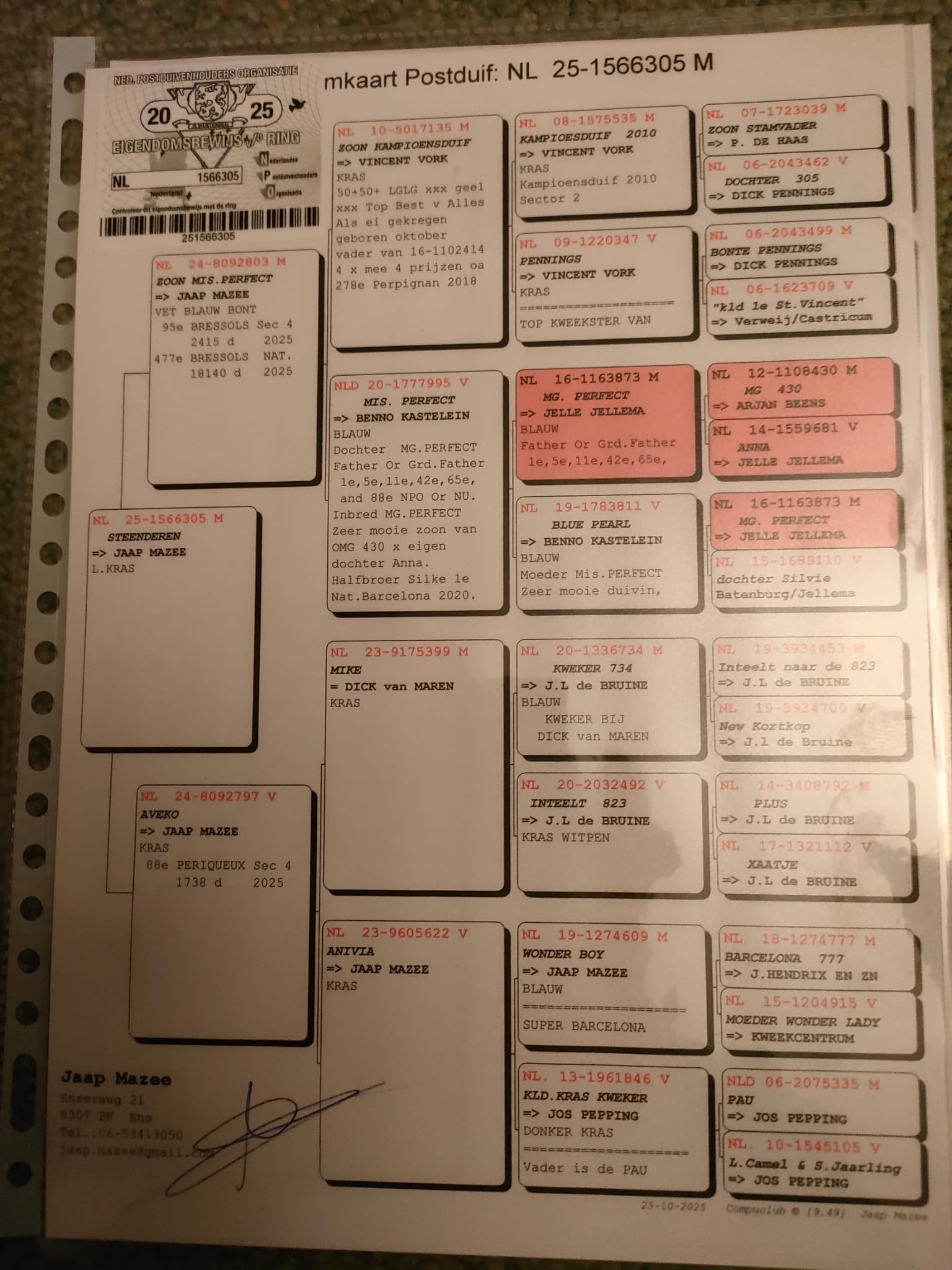 Koop 46 Jaap Mazee, Ens (NL) schenkt jonge duif 2025 uit twee talentvolle jaarlingen (zie pedigree)
