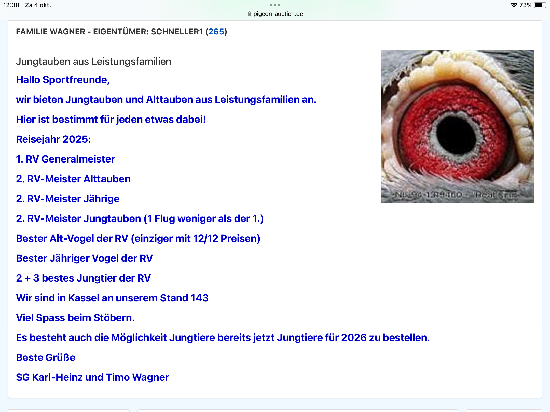 Al heel wat jaren spreekt de naam Wagner internationaal tot de verbeelding. Al een duivenleven lang wordt enorm goed gepresteerd door Karl-Heinz en Timo … in 2025 werd alweer maar het 1e RV generaal kampioenschap binnengesleept met o.a. de 1e oude asduif RV en 1e jaarling asduif RV. Het duivenbestand bestaat uit Internationaal gekende lijnen, die ook op One Loft Races al jarenlang fantastisch presteren!