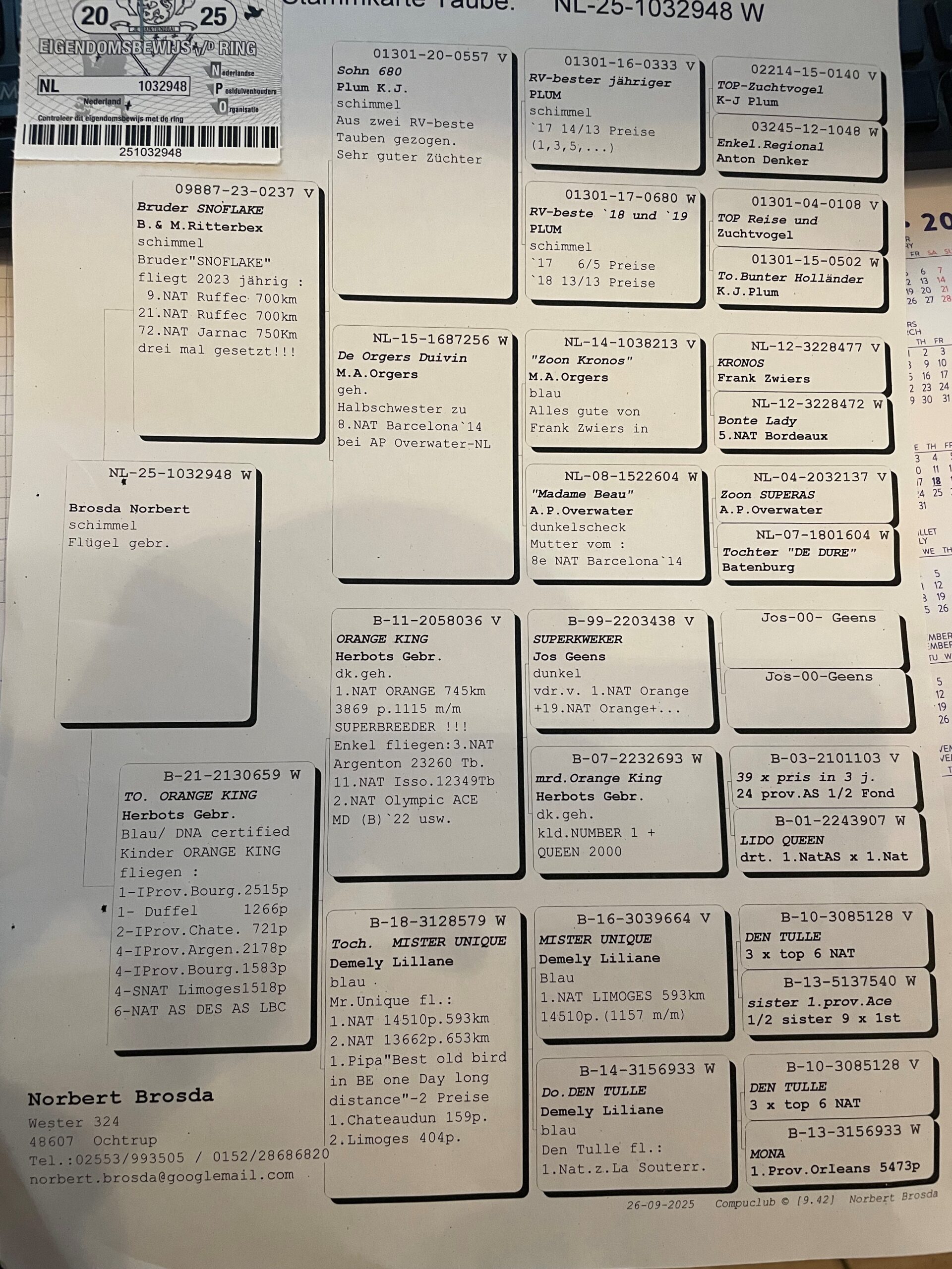 Aan PV Zutphen schenkt hij een jonge duivin van 2025, uit een dochter van ‘Orange King’ Herbots, met zelf 1e Nat. Orange 745 km tegen 2.869 duiven en vader van o.a. 1e I.prov. 458 km 2.515 d., 1e prov. 475 km 4.249 d., 2e I.prov. 509 km 721 d., 2e Nat. asduif, 4e I.prov. 458 km 4.454 d., 4e I.prov. 538 km 2.178 d., 4e I.prov. 538 km 2.182 d., 4e s-Nat. 700 km 1.518 d. … Hier gekruist met een volle broer van ‘Snowflake’, in 2023 als jaarling winnaar 9e Nat. Ruffec, 21e Nat. Ruffec en 72e Nat. Jarnac.