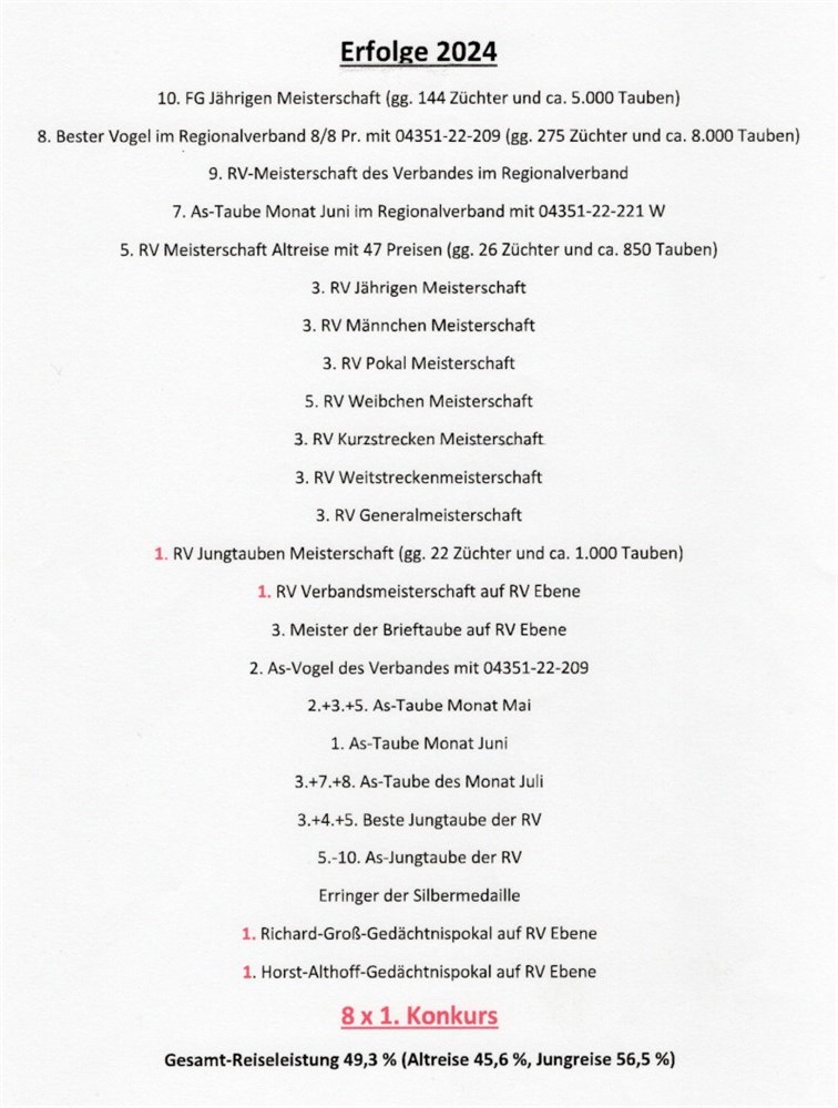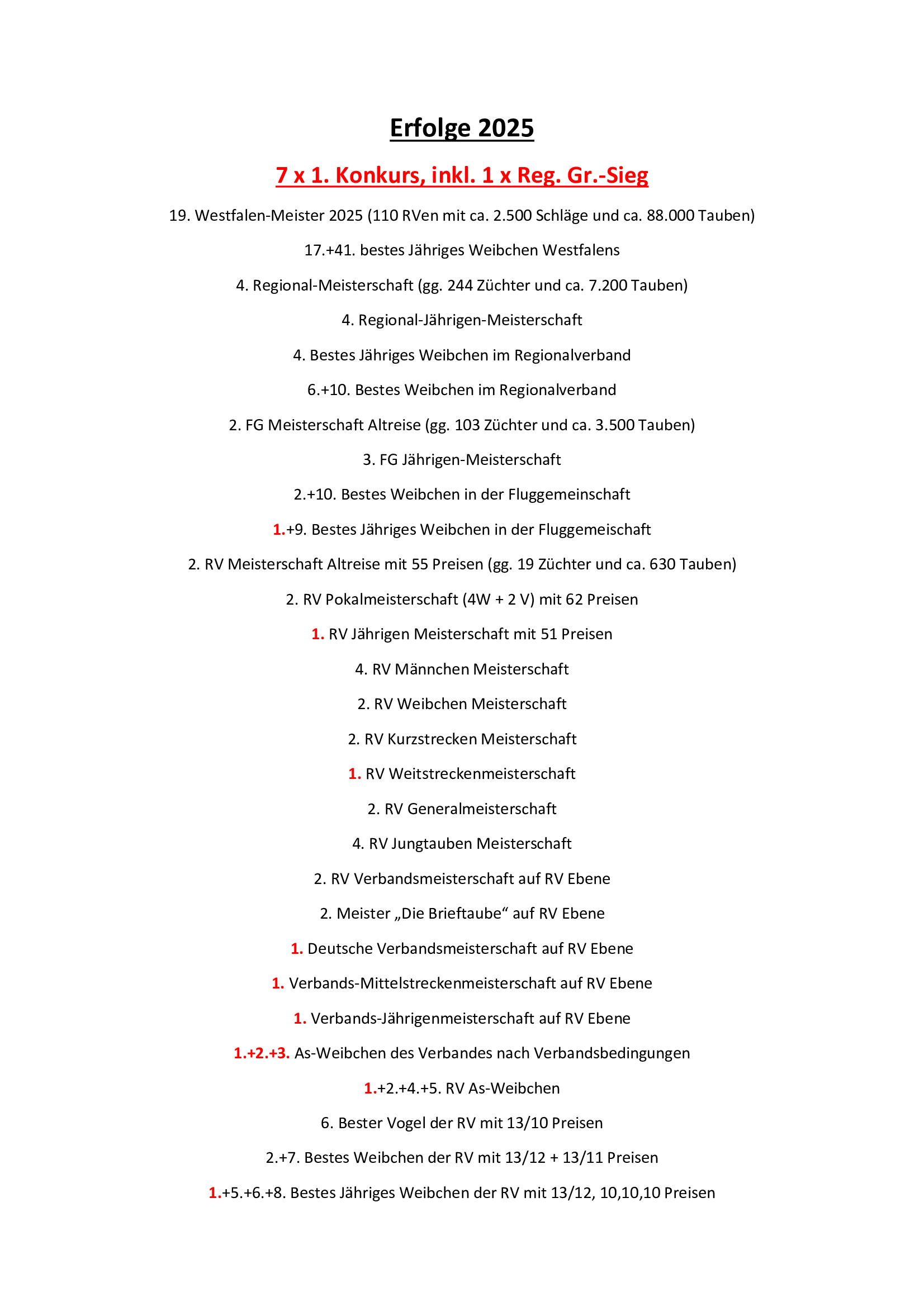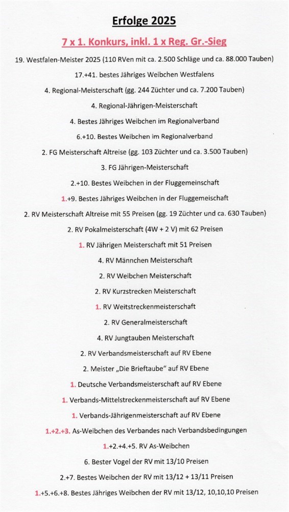 2025 werd een superjaar voor Siegfried en Frederick Staniszeswske uit Dortmund … met echte kettinguitslagen en maar liefst 7 keer begonnen met de 1e prijs! Dan weet je ook bijna zeker dat een lange lijst aan kampioenschappen het logische vervolg is en niets is minder waar. Verschillende top 10 provinciale asduiven en top 5 provinciale kampioenschappen waren de oogst na een zeer goed jaar. Ook in 2024 waren er al 8x 1e prijzen en dat allemaal dankzij een kweekhok van uitzonderlijke kwaliteit waar bloedlijnen van veel ‘groten der aarde’ vertoeven.
