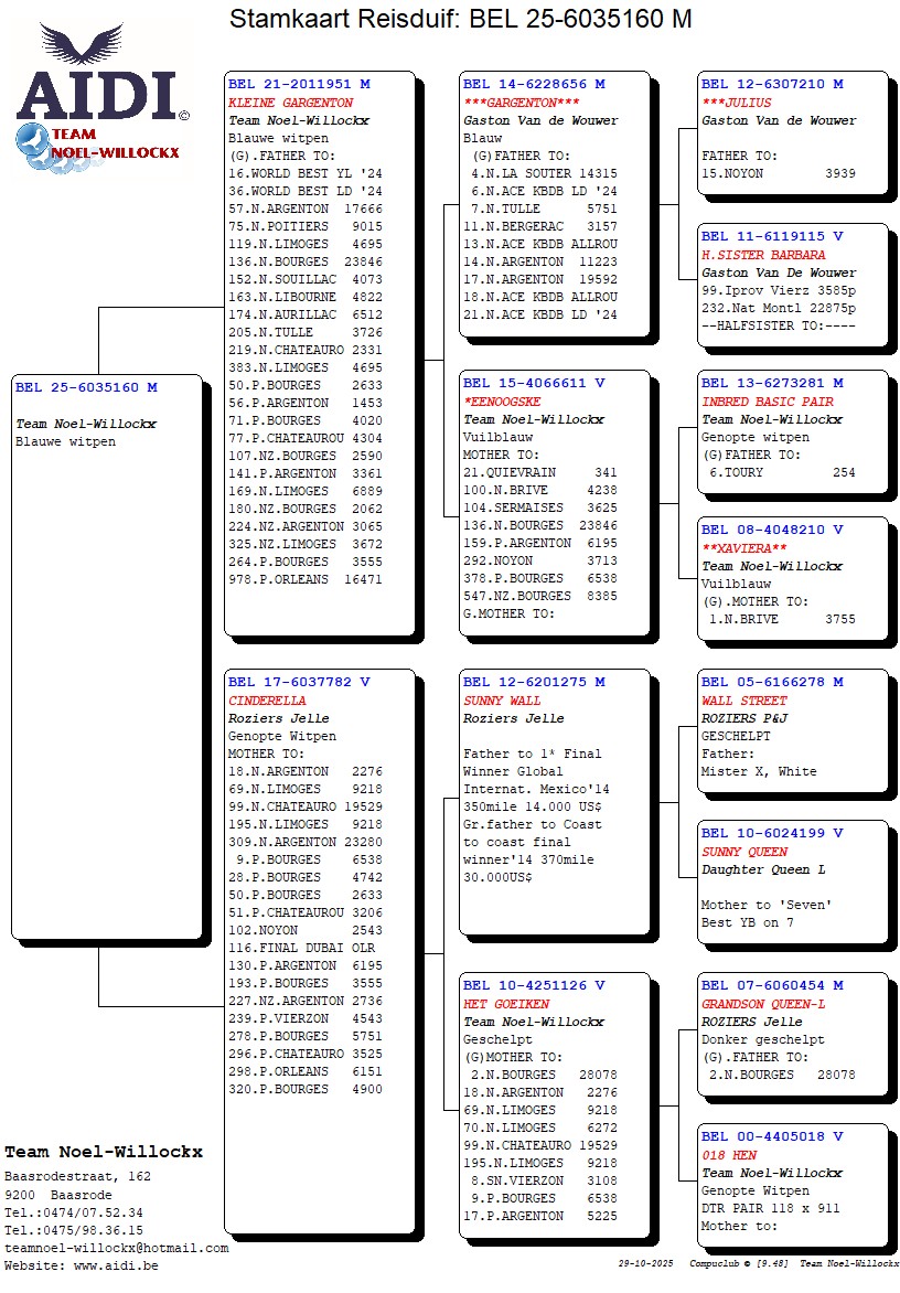 Koop 31 Team Noël-Willockx, Baasrode (BE) schenken jonge duif 2025 uit ‘Kleine Argenton’ x ‘Cinderella’ (zie pedigree)