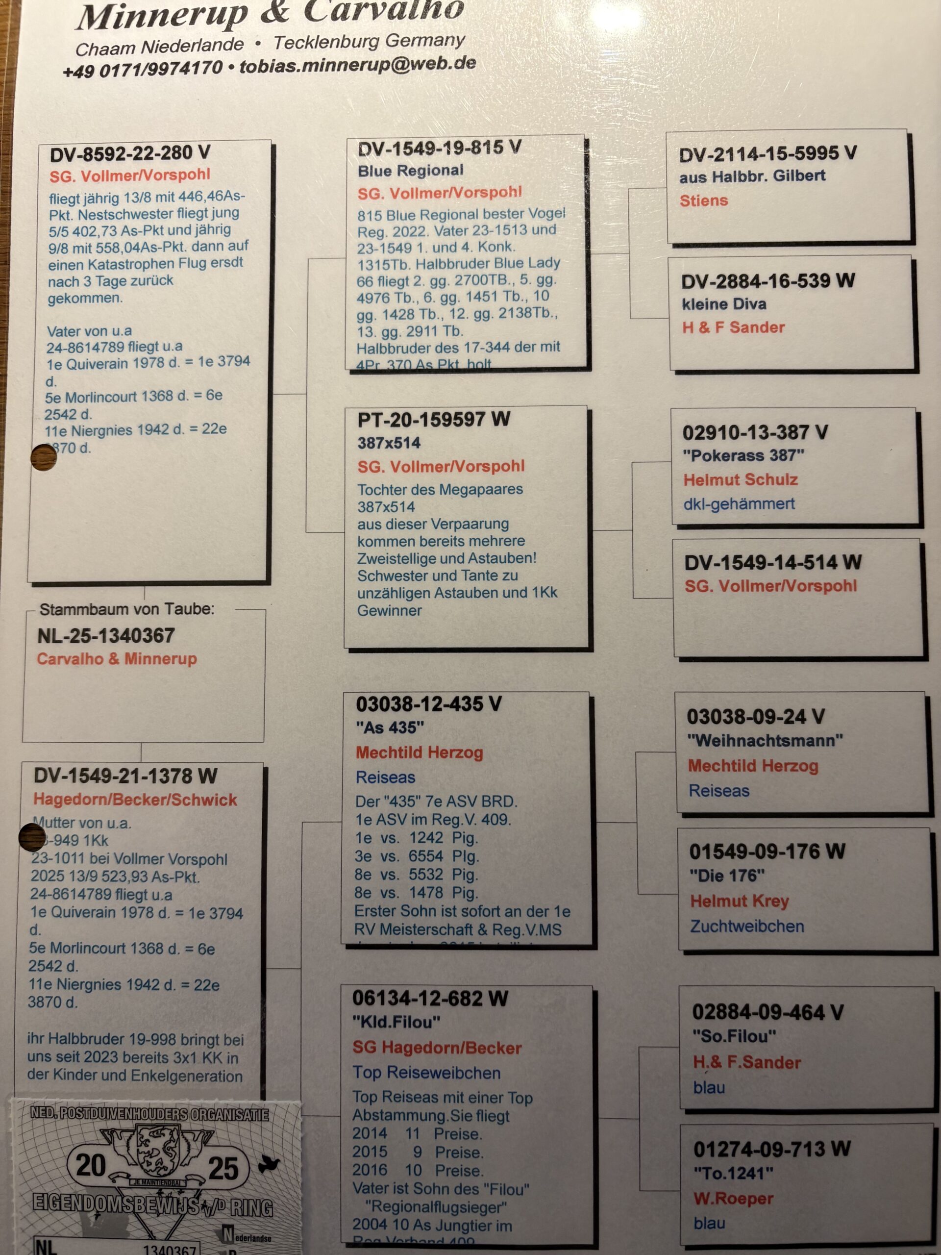 En de Comb is zeer gedreven en er wordt niets aan het toeval overgelaten. Helder schenkt een jong 2025 die afkomstig is uit duiven van Duitse origine waar Helder en Tobias zo succesvol mee zijn. Helder heeft in Portugal en Duitsland met duiven gespeeld en is voor de liefde in Chaam neergestreken en heeft in enkele jaren topresultaten weggezet deze resultaten komen bij niemand aanwaaien. Ook bij Helder niet, die samen met z’n compagnon Tobias beschikt over een fantastisch kweekhok waar deze schenking is geboren.