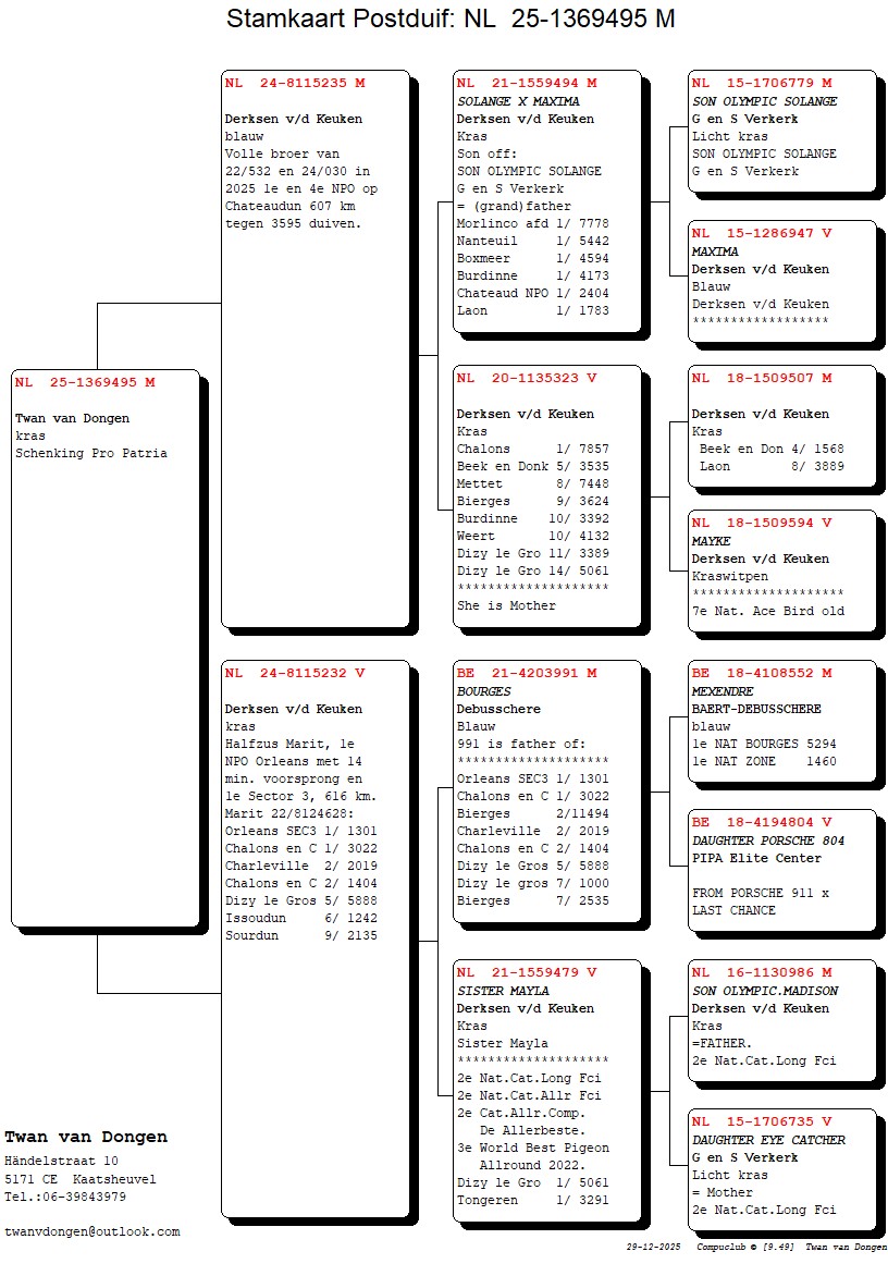 Twan schenkt voor Pro Patria een prachtige jonge doffer uit het beste van de combinatie Derksen & van de Keuken. De zussen van de beide ouders spelen in 2025 zowel de 1e  NPO op Chateaudun als de 1e NPO op Orleans en tevens 1e in Sector 3.