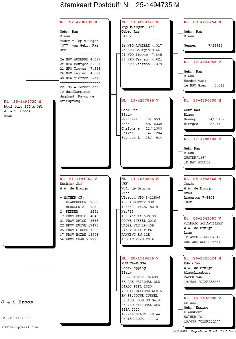 Jippe en Sibble Kees Broos waren over het hele seizoen gezien het tweede beste hok onaangewezen van Noordoost Fryslân en ze werden bovendien kampioen in hun eigen rayon de Wâlden. En dat komt niet uit de lucht vallen want ook in voorgaande jaren presteerden ze constant op hoog niveau. Hun voorliefde gaat uit naar snelheid- en midfondvluchten, onderdelen waar ze ook al jarenlang op uitblinken. Ze baseerden hun kolonie op duiven van Gebr. Van Den Brande, Berlaar, rechtstreeks gehaald. Duiven uit o.a. ’Diamant’ en ‘Piraat’ verhuisden naar Fryslân. Er werd ook aangeklopt bij Ad Schaerlaeckens en daar lukten ze ook uitstekend mee. Ze bezitten daarnaast een aantal uitstekende kwekers van Falco Ebben, Gebr. Leideman en Willem de Bruijn. Ook kweekten ze samen met Gebroeders Ras, Urk en ook dat lukte buitengewoon. Ze hadden twee jaar geleden een Olympiadeduif bij de jonge duiven in de sportklasse. Hier geen vergane glorie. In 2024 speelden ze zich kampioen in Rayon de walden en samenspel de Eenheid en de resultaten 2025 waren opnieuw buitengewoon. Een echt tophok!