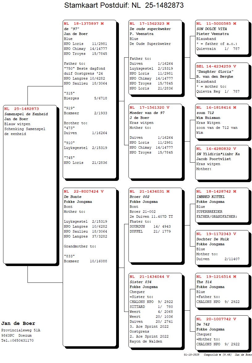 Zelf won deze doffer een 11e NPO Lorris 2981 d. … 14e NPO Chimay 14.777 d. en 15e NPO Troyes 7845 d.. En hij werd al vader van de ‘750’, 1e Asduif CC de Oostgrens in 2024 met o.a 10e NPO Langres 6282 d. en 18e NPO Saulieu 3064 d. Moeder van de schenking van Jan is ‘de Bonte’, een duivin die ook moeder is van de hiervoor genoemde ‘750’ en eerder al moeder werd van 2e Luyksgestel 15319 d.