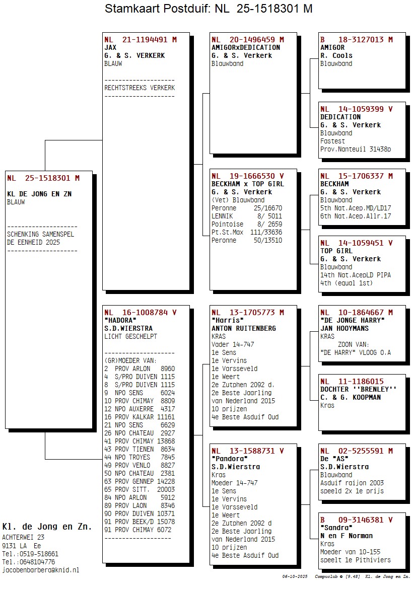 Zonder meer een van de beste hokken van afdeling Friesland ’96 en dat geldt des te meer voor de resultaten op de eendaagse fondvluchten. Steeds weinig duiven in de wedstrijd en toch heel vaak meerdere duiven in het snuitje van de uitslag plaatsen is een kwaliteit op zich. In 2019 1e Generaal kampioen Lang (Midfond, Eendaagse Fond en 4 midfondvluchten met de jonge duiven) van afdeling 11, in 2022 2e en in 2024 3e. De lijn zo kunnen doortrekken getuigt van echte klasse duiven. Vader en zoon bouwden hun hok op rond een echt superkoppel: ‘ de 10’ x ‘Fionella’ waarvan de kinderen, kleinkinderen en verdere nakweek echte kopvliegers op provinciaal niveau geven, en die zich zeker en vooral melden als het bergop gaat. ‘Fionella’ is een dochter van een bijzonder kweekkoppel van Danny van Dijck, Pulle (B): Uit ‘Nieuwe zoon Di Caprio’ x ‘Dochter den 11’.
