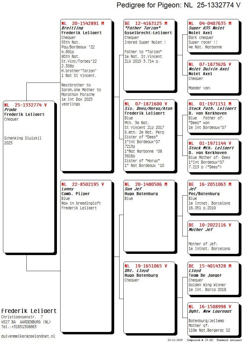 Frederik is een ijzersterke marathonduivenliefhebber uit Zeeuws Vlaanderen, Aardenburg. Hij won meerdere (inter)nationale vluchten en talloze kopprijzen. Hij heeft door de jaren heen een eigen stam opebouwd. Door de goede band met de familie Gysselbracht en Hugo Batenburg zijn er ook duiven van deze hokken ingebracht, maar hij kijkt verder en er zijn meer goede duiven ingebracht. De basis is topkwaliteit!