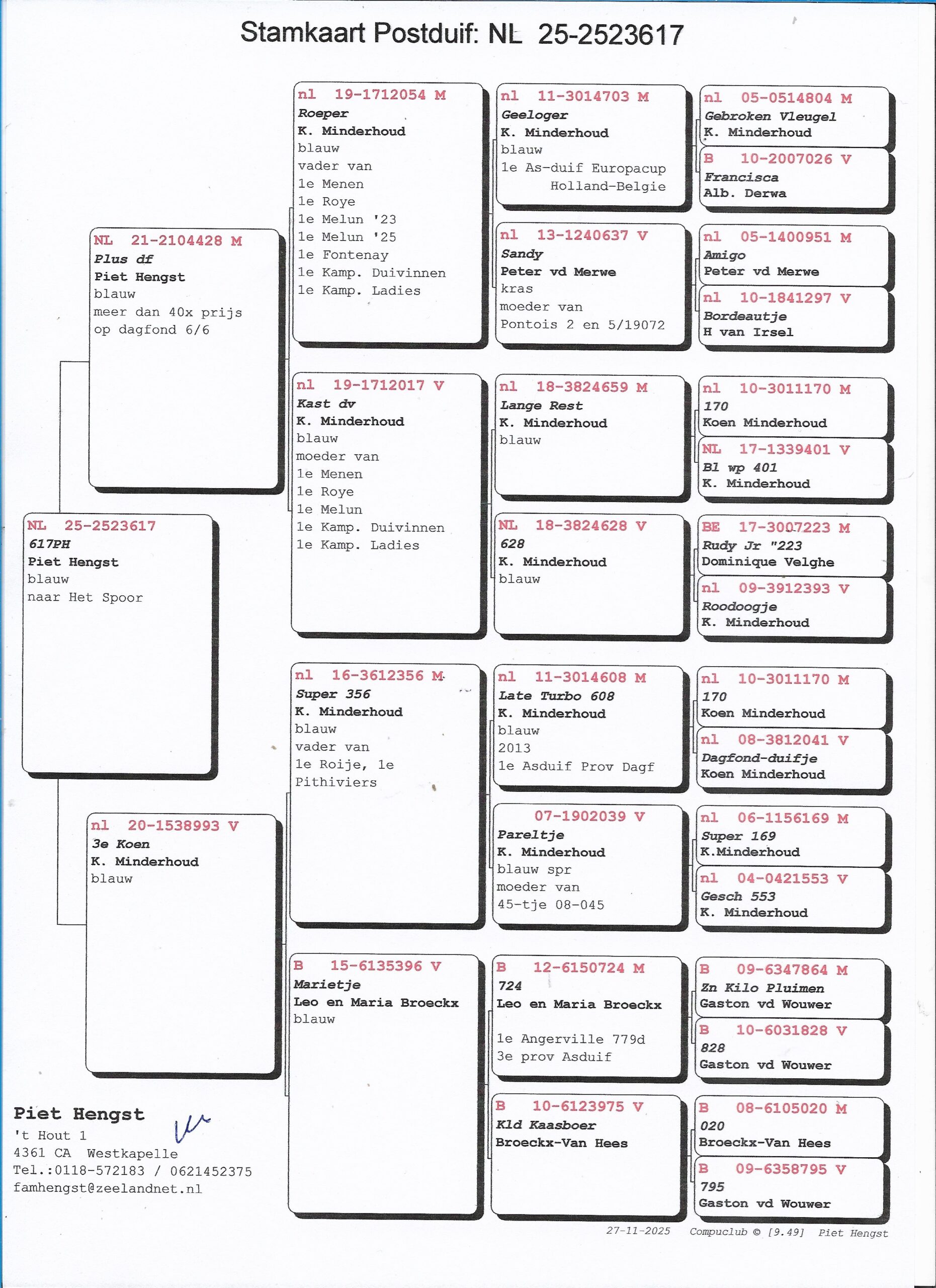 Nog niet lang geleden werd Piet 1e Onaangewezen, 1e Aangewezen en 1e Keizer op de marathon in Zeeland (2024). Met duiven van Jo Melis, Loek Waasdorp, de combinatie Flipse en de combinatie Verhagen-Bijl speelde hij de Kampioenschappen en leuke uitslagen bij elkaar. Maar ook op andere onderdelen doet hij heel goed mee: 5-12-14 Melun Andrezel/8.675 d., 12-14 Melun Andrezel/9.113 d. en 14e Issoudun ZAC/601 duiven kunnen zijn duiven ook de kortere zware vluchten aan. Hij scoorde al vroeg in het seizoen een Clean Sweep met maar liefst 26 uit 26. Nationaal in 2024 3e Marathon Aangewezen, 9e Marathon Hok en 21e Marathon Duif. In 2025 7e St Vincent 10.263 duiven, Winnaar Grootmeester Roye 26 van de 26. GoudenDuif competitie 2e op de Halve Fond. Olympiad Pigeon Marathon 9e. Met programmaduiven van Koen Minderhoud (Geeloger en Nieuwe Turbo), van Willem Minderhoud en van Jan Hengst. Met marathonduiven afstamming Verhagen-Buyl, Combinatie Flipse en Jo Melis.