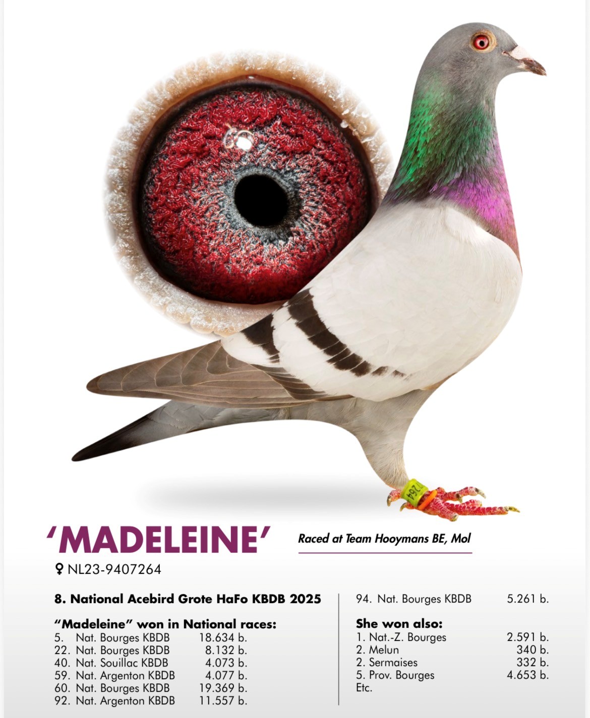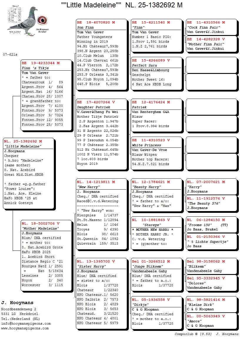 Jan Hooymans en Christian van de Wetering oftewel Team Hooymans NL. Spelen al jaren de pannen van het dak in Midden Nederland en gaan voor overwinningen en mooie uitslagen. Het hok wat bekend is geworden om zijn ‘Harry’ en vele presterende nazaten. Maar er zijn meer toppers aanwezig. Om u een klein voorbeeld te geven van de prestaties van 2025 hierbij een beknopt overzicht op Provinciaal niveau: 1-3 Quievrain/7.307 d., 1e La Ferte Saint Aubi/4.572 d., 1-3-4-5-6-8-10 Orleans/484 d., 2-9-18 Chateaudun/2.084 d., 3e Morlincourt/12.757 d., 6e Pont Saint Maxence/10.167 d., 7-8 Quievrain/13.705 d., 4e Niergnies/4.015 d., 6-7-12 Issoudun ZAC/1.854 duiven en zo vele mooie uitslagen meer. Men werd 1e Onaangewezen en 1e Aangewezen Dagfond en men had een 3e Nationaal Dagfond Duif.
