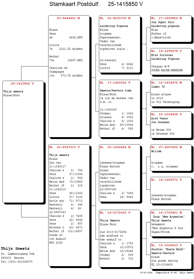 Thijs maakte een heel goed seizoen mee en mocht dat bekronen met een 1e Nationaal Hok Midfond Onaangewezen en een 10e Beste Nationaal Asduif. Dat doe je niet zomaar. Hij speelde in 2025 o.a: 2e Brienne la Vieille/6.671 d., 2-3-4 Sens/3.650 d., 1-10 Brienne la Vieille/1.567 d., 2e Chalons en Champagne/7.485 d., 4e Rethel/3.775 d., 1e Chalons en Champagne/1.885 d., 7-9 Lorris/2.101 d., 2-3-4 Sens/981 d., 7e Marche/2.246 d. en 2e Charlevilles Meriere/2.196 duiven. Zomaar een greep van wat uitslagen. Thuis speelt met duiven van Jos Goessen enwel lijnen ‘Argenton’ en ‘New Argenton’, Math Claasen en het oude Klak soort. Met deze 3 lijnen bouwde hij zijn voortvarende kolonie op.