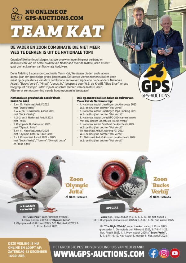 Eindigt: 13-12-2025 16:30GPS-Auctions presenteert: Team Kat, Westzaan. DE VADER EN ZOON COMBINATIE DIE NIET MEER WEG TE DENKEN IS UIT DE NATIONALE TOP!! Ongelooflijke kettinguitslagen, talloze overwinningen in groot verband en absoluut één van de beste hokken van Nederland over de laatste jaren als het gaat om het kweken van Nationale Asduiven. De in Afdeling 6 spelende combinatie Team Kat, Westzaan bieden zoals al een aantal jaar een geweldige groep jongen aan. De laatste vierseizoenen staat er geen maat op de prestaties van deze combinatie en kweken zij de ene na de andere Nationale Asduif. “Bucks Verbij”, “Milou”, “Janus Jr.” (gespeeld door W.B. de Kruijf), “Blue Sifan” en als hoogtepunt “Olympic Jutta” zijn de absolute sterren van de laatste jaren. Allereerst een opsomming van de hoogtepunten in Westzaan! Nationale en provinciale asduif titels 2022 t/m 2025 - 5e en 10e Nationaal Asduif 2022 met “Bucks Verbij” - 3e, 4e, 4e en 10e Nationaal Asduif 2023 met “Bucks Verbij” - 1e, 2e, 2e en 3e Nationaal Asduif 2024 met “Milou” - 1e Olympiade Duif Allround 2025 met “Olympic Jutta” - 5e en 11e Nationaal Asduif 2025 “Olympic Jutta” en “Blue Sifan” - 7 x 1e Provinciaal Asduif 2022 – 2025 met “Bucks Verbij”, “Yvonne”, “Olympic Jutta” en “Blue Sifan”. Provinciale kampioenschappen In de afgelopen twee jaar maar liefst 14 (!!) Provinciale kampioenschappen, namelijk: - 1e Dagfond onaangewezen 2024 - 1e Oud onaangewezen 2024 - 1e Oud aangewezen 2024 - 1e Duifkampioen oud met “Yvonne” 2024 - 1e Natour onaangewezen 2024 - 1e Supervitesse onaangewezen 2024 - 1e Generaal onaangewezen 2024 - 1e Keizerkampioen Fondclub Noord-Holland 2024 - 1e Midfond aangewezen 2025 - 1e Oud aangewezen 2025 - 1e Duifkampioen oud met “Blue Sifan” 2025 - 1e Generaal aangewezen 2025 - 1e Duifkampioen generaal met “Olympic Jutta” 2025 - 1e Keizerkampioen Fondclub Noord-Holland 2025 Absoluut niemand deed beter! Ook op andere hokken halen de duiven van Team Kat de Nationale top: - 4e Nationaal Asduif Jaarlingen de Allerbeste 2023 W.B. de Kruijf uit dochter “Kai Verbij” - 5e Nationaal Asduif Jaarlingen Pipa Ranking 2023 W.B. de Kruijf uit dochter “Kai Verbij” - 8e Nationaal Asduif Jong NPO 2024 samenkweek met R.C. Bakker uit Artus x “Bucks Verbij” - 9e Nationaal Asduif Snelheid De Allerbeste 2024 W.B. de Kruijf uit dochter “Kai Verbij” - 10e Nationaal Asduif Jaarling FCI 2023 W.B. de Kruijf uit dochter “Kai Verbij” - 11e Nationaal Asduif Allround de Allerbeste 2024 W.B. de Kruijf uit dochter “Kai Verbij” In deze veiling komen al deze toppers terug. Een zeer select groepje van 5 jonge duiven. Voor Team Kat geldt dat enkel de allerbeste goed genoeg zijn en dat proberen zij daarom ook in deze veiling aan te bieden: - Het eerste jong ooit verkocht uit de absolute ster van 2025 “Olympic Jutta”, 1e Olympiade Duif Allround 2025. - Een dochter van haar nest-zus “Blue Sifan”, zelf ook 8e Olympiade duif grown up, 11e Nationaal Asduif Dagfond en 22e Nationaal Asduif Midfond in 2025! Deze “Blue Sifan” is in zeer korte tijd reeds moeder van 7e NPO en 2-9-9. Prov. Asduif! - Een zoon van “The Night Watch” nieuwe ster kweker op het hok en grootvader van de twee super zussen “Olympic Jutta” en “Blue Sifan” x “Bucks Verbij” zelf Nationale Asduif en reeds moeder van 1e Prov. en de nationale asduif op de hokken van R.C. Bakker in Zoelen! - Een zoon van “Albina’s Dream” kweek talent uit de hokken van Gerard Koopman! Grootmoeder van de super zussen "Olympic Jutta" en "Blue Sifan" x de vader van “Bucks Verbij”. - Tot slot een doffer uit de grootvader van 1e Nationaal Asduif 2024 “Milou” gekoppeld op de moeder van “Milou” (weer dochter “Kai Verbij”) Een topaanbod van de combinatie uit Westzaan.
