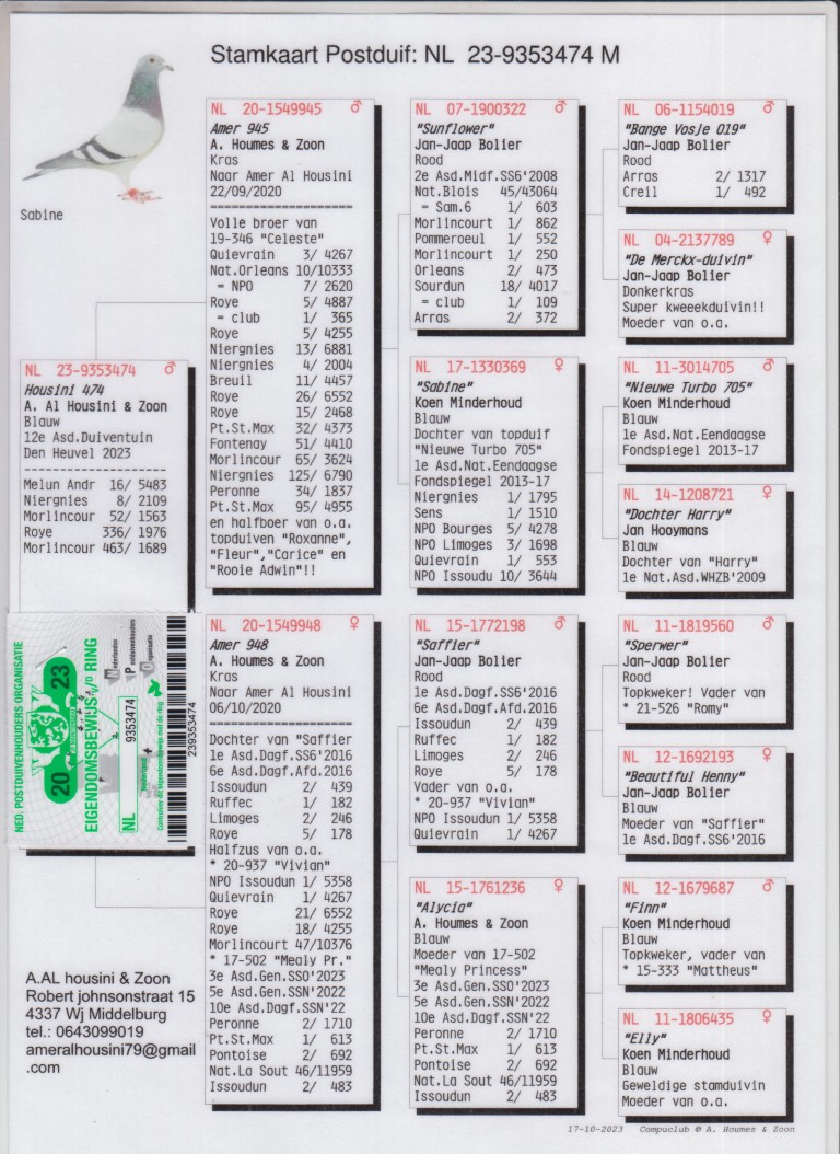 ”Housini 474”, 12. Asduif Jonge, 8. Niergnies 2.109 d., 16. NPO Melun 5.483 d., 52. Morlincourt 1.563 d., uit: ”Amer 945”, A. Houmes & Zn. x ”Amer 948”, A. Houmes & Zn., dochter ”Saffier”, 1. Ruffec, 2. Issoudun, 2. Limoges