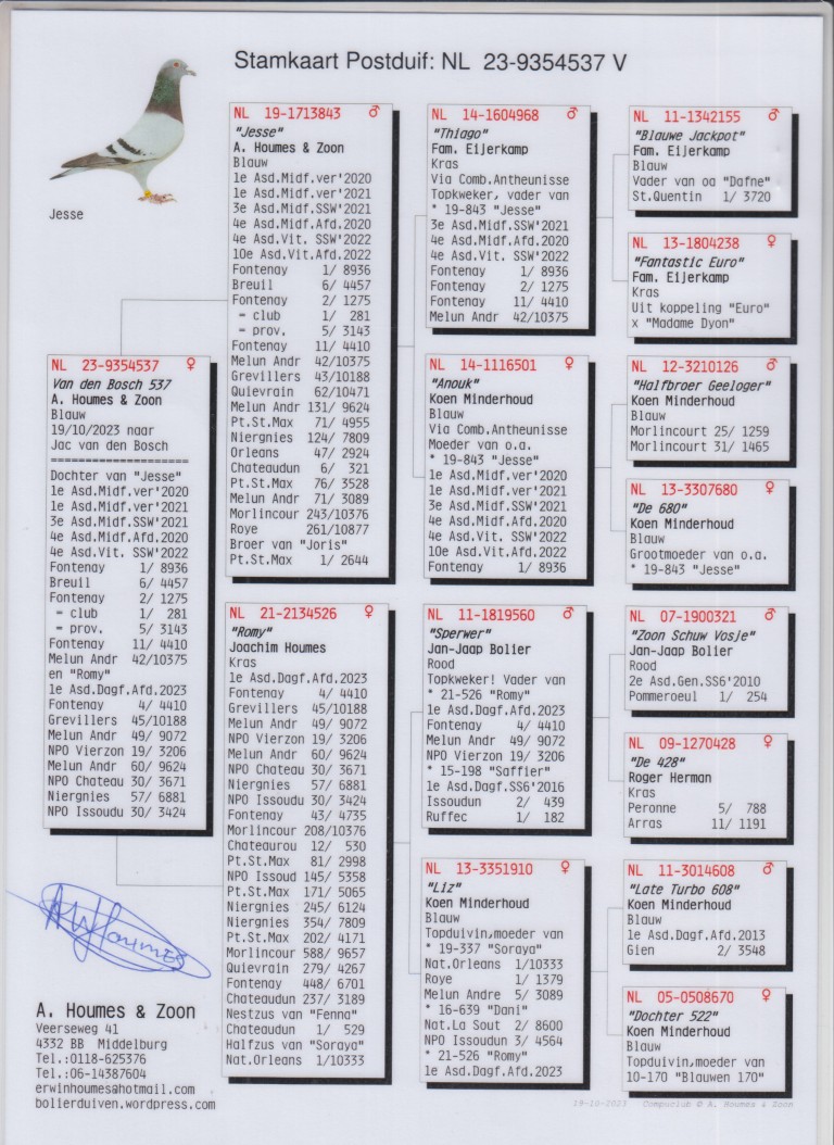 Uit: ”Jesse”, 1. Asduif Midfond 2020 & 2021, 1.-8.936 d., 2.-1.275 d., 4. Prov. Asduif Midfond, 6.-4.457 d., 10. Prov. Asduif Vitesse, 11.-4.410 d. x ”Romy”, 1. Prov. Asduif Dagfond, 4.-4.410 d., 1/2 zus ”Soraya”, 1. Nat. Orleans 10.333 d.