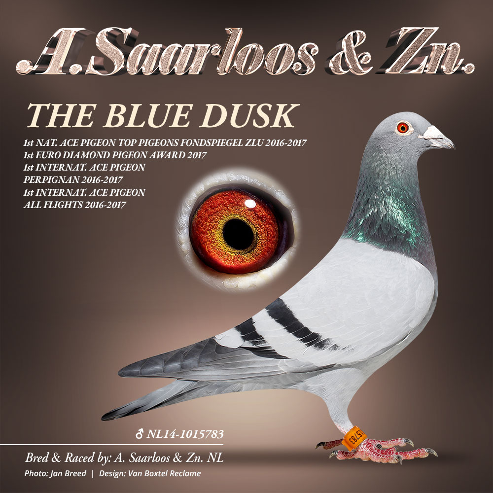 Uit: ”Kweker 61”, vader & gr-vader 6. Nat. Tarbes ZLU, 23.-39.-72.-74.-80.-84. Nat., uit zoon ”Prins Barcelona” x ”Dochter Blue Dusk”, dochter ”The Blue Dusk”, 1. Europese Asduif Int. Vluchten & Absolute Superkweker