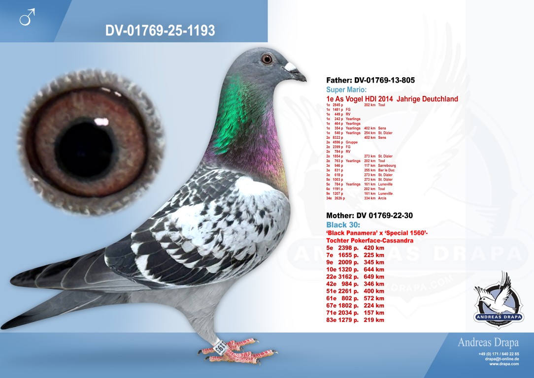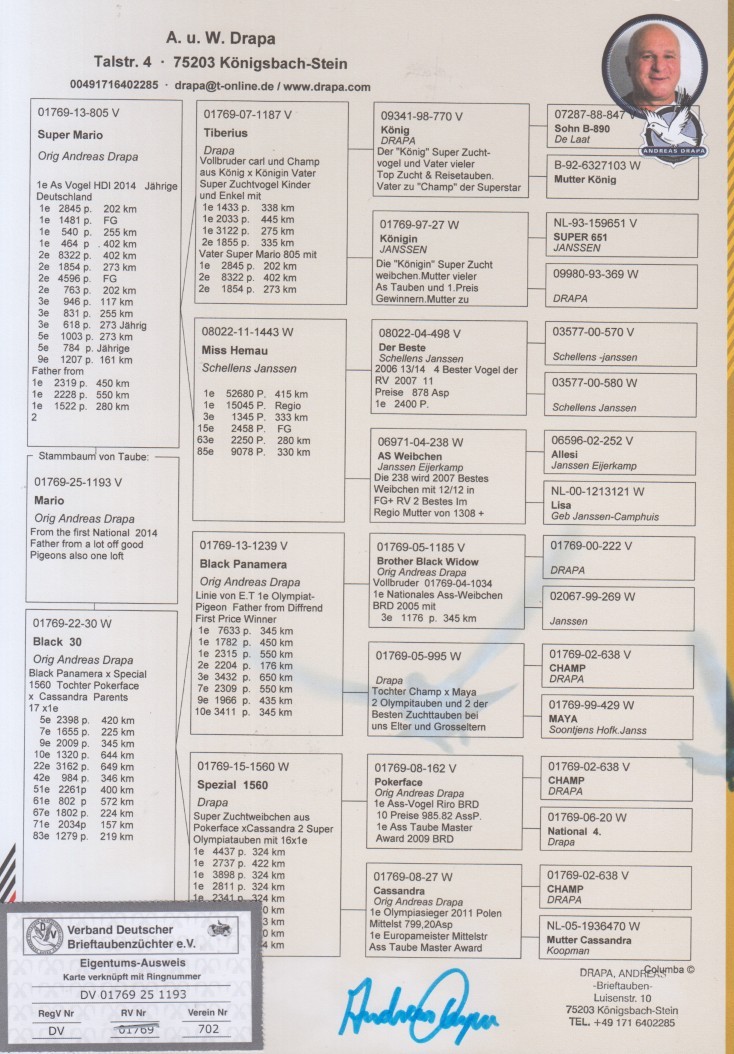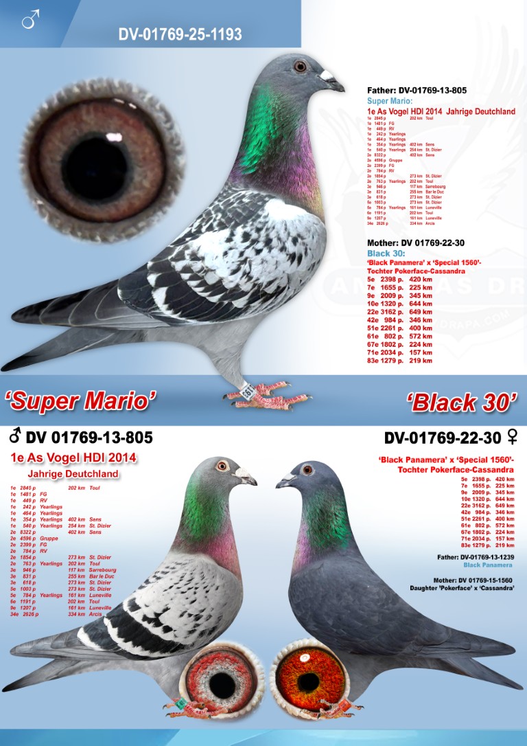 Uit: ”Super Mario”, 1. Nat. Asduif Jaarlingen Duitsland, 1.-2.845 d., 1.-1.481 d., 2.-8.322 d., 2.-4.596 d., 2.-1.854 d., vader 1.-2.319 d., 1.-2.228 d., 1.-1.522 d. x ”Black 30”, 5.-2.398 d., 7.-1.655 d., 9.-2.009 d., 10.-1.320 d.