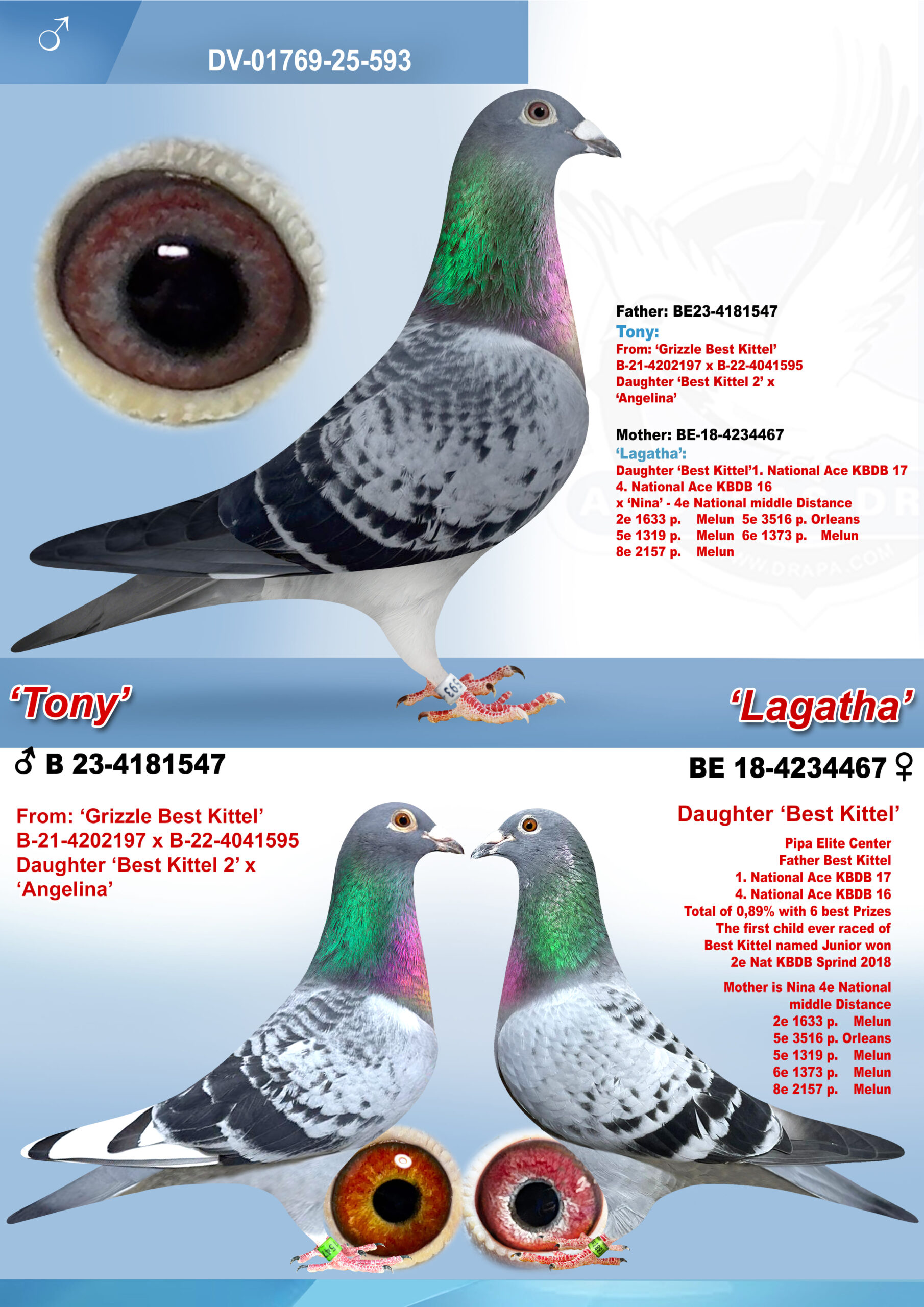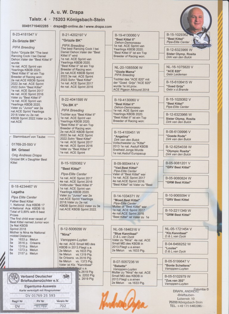 Uit: ”Zoon Grizzle Best Kittel”, zoon ”Grizzle Best Kittel”, 2. Nat. Asduif Sprint KBDB (Achter hokgenoot), uit dochter ”Best Kittel II”, 1. Nat. Asduif Sprint KBDB x ”Lagatha”, dochter ”Best Kittel”, 1. & 4. Nat. Asduif Sprint KBDB