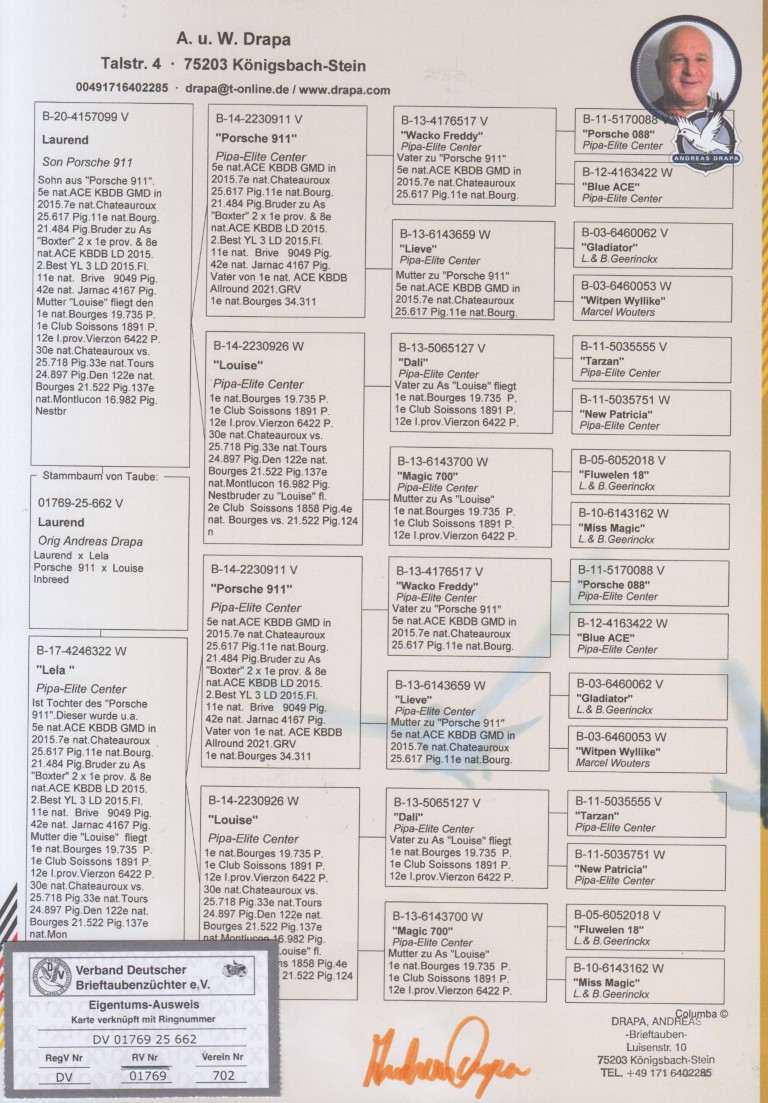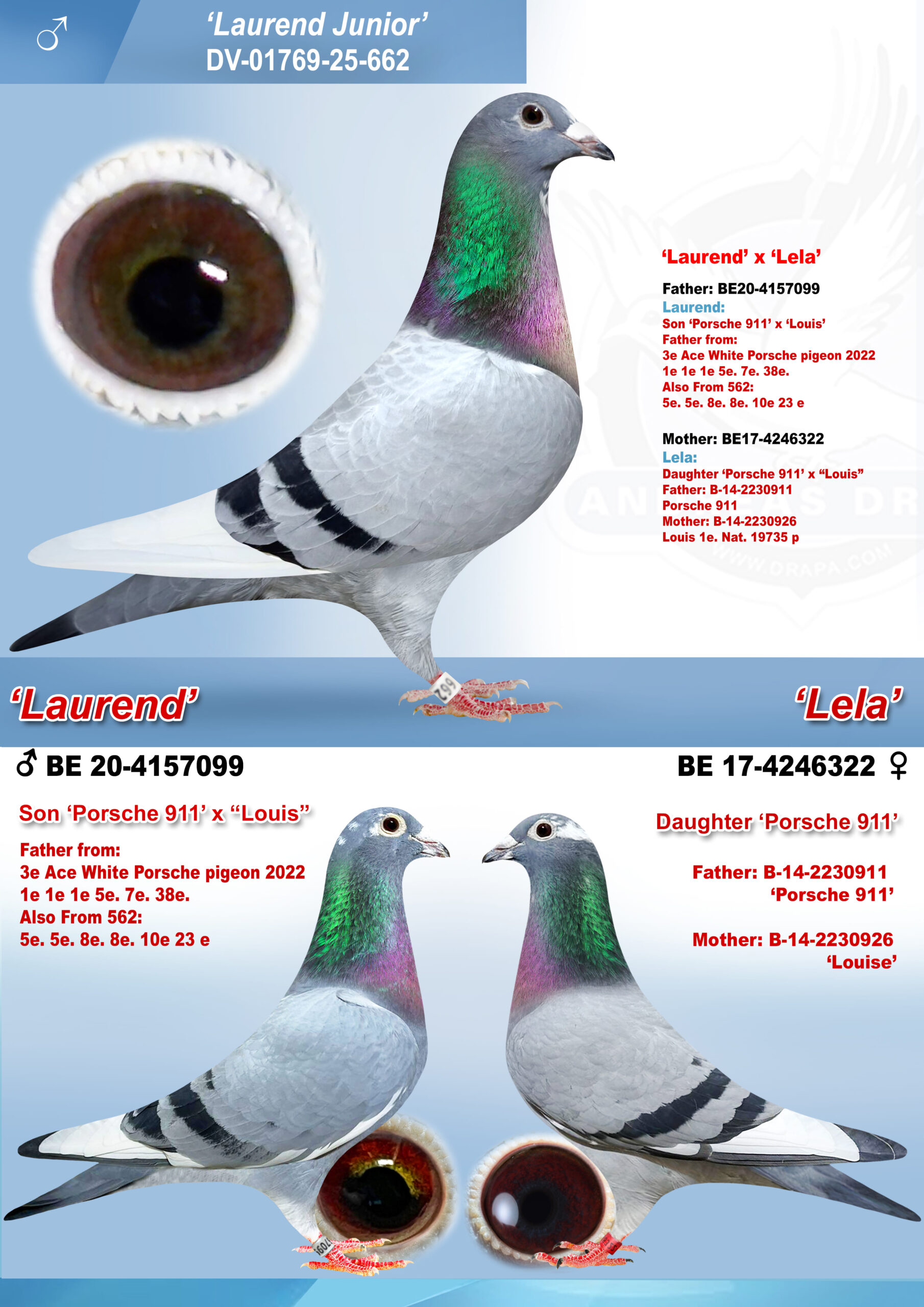 Uit: ”Panamera”, vader 4. Inter-Prov. Nevers 5.878 d., broer 1. Nat. Asduif Allround KBDB, zoon ”Porsche 911” & ”Louise” x ”Lela”, dochter ”Porsche 911”, 5. Nat. Asduif KBDB & PEC Stamvader, dtr. ”Louise”, 1. Nat. 19.735