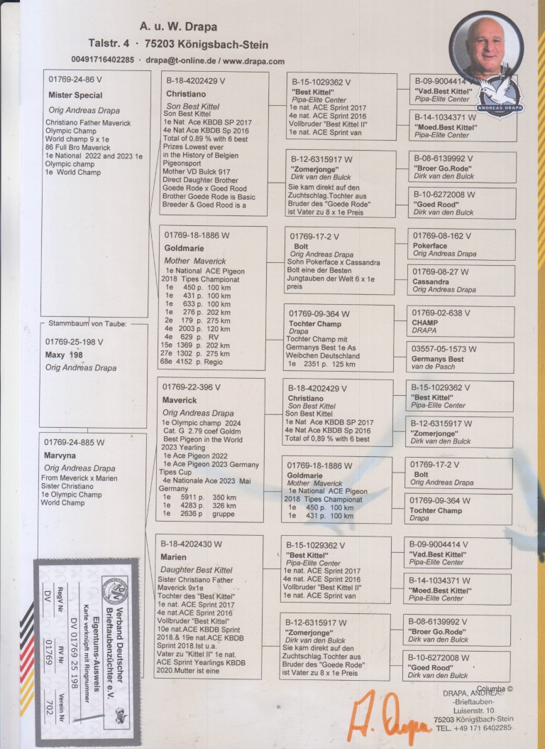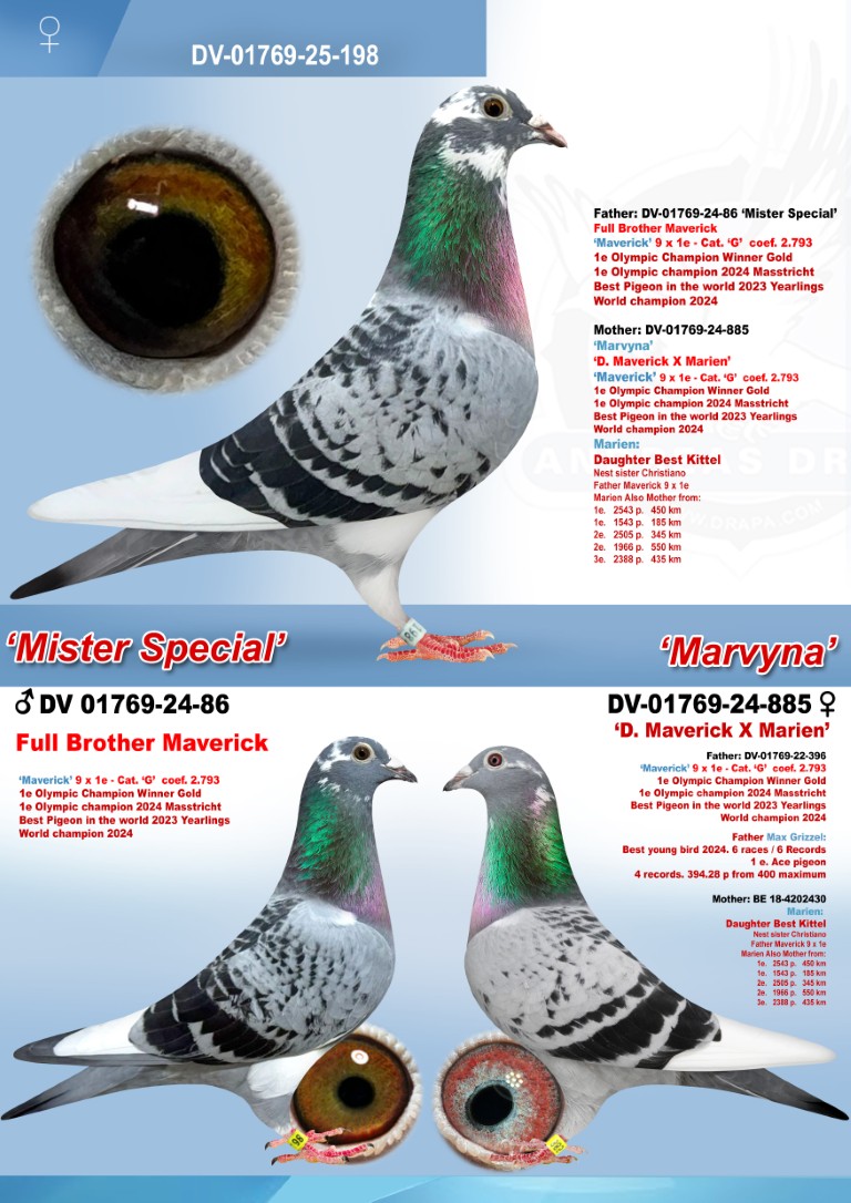 Uit: ”Mister Special”, 1/2 broer ”Maverick”, 1. Int. Asduif Jaarlingen, 1. Olympiade duif, uit zoon ”Best Kittel” x ”Marvyna”, dochter ”Maverick”, 1. Int. Asduif Jaarlingen, 1. Olympiade duif, inteelt kld. ”Best Kittel”