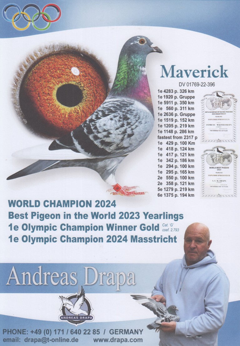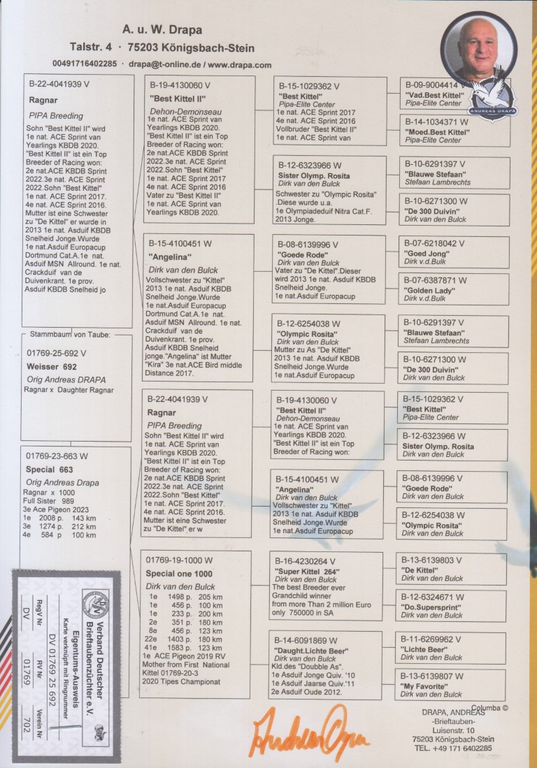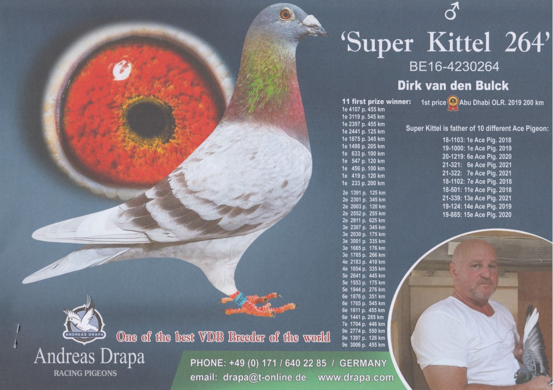 Uit: ”Ragnar”, zoon ”Best Kittel II”, 1. Nat. Asduif Sprint KBDB & vader ”Grizzle Best Kittel”, 2. Nat. Asduif Sprint KBDB (Achter hokgenoot) x ”Special 663”, 3. Asduif, 1.-2.008 d., 3.-1.274 d., uit zoon ”Best Kittel II”
