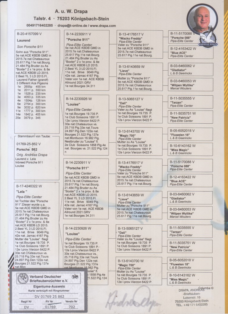 Uit: ”Laurend”, zoon ”Porsche 911”, 5. Nat. Asduif KBDB & PEC Stamkweker, zoon ”Louise”, 1. Nat. Bourges 19.735 d. x ”Lela”, dochter ”Porsche 911”, 5. Nat. Asduif KBDB & PEC Stamkweker, dtr. ”Louise”, 1. Nat. Bourges 19.735 d.