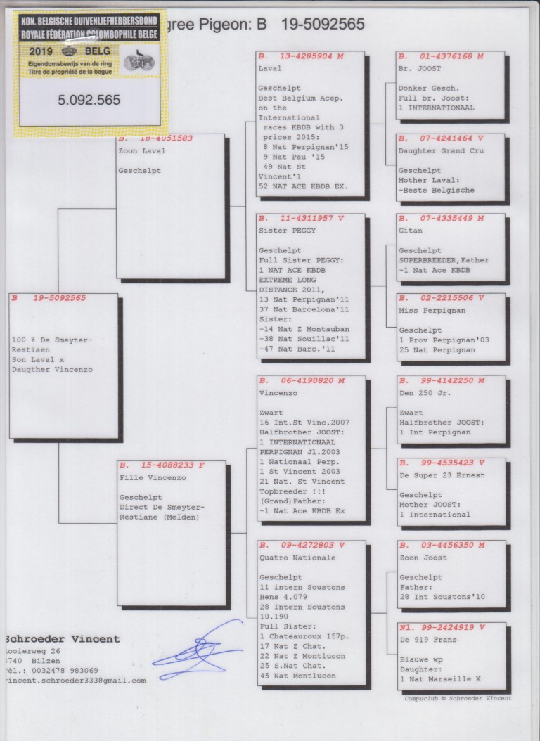 Uit: ”Zoon Laval”, 1. Nat. Asduif Int. Ranking, 2, Nat. Asduif KBDB, 8. Nat. Perpignan, 9. Nat. Pau x ”Fille Vincenzo”, dochter ”Vincenzo”, 16. Int. St.Vincent, dochter ”Quatro Nationale”, 11. Int. Soustons Hens 4.079 d.