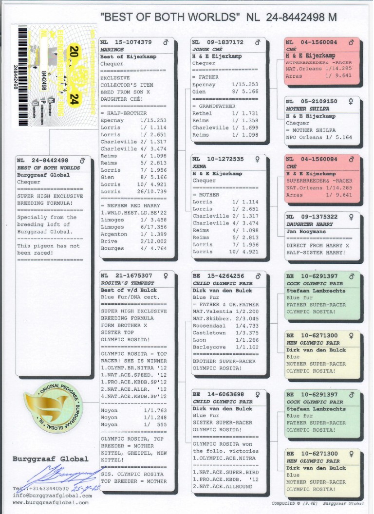 Uit: ”Marinos”, uit zoon x dochter ”Ché”, 1. Nat. Orleans 14.285 d. & 1. Arras 9.641 d., uit kld. ”Harry”, 1. Nat. Asduif WHZB x ”Rosita’s Tempest”, inteelt ”Olympic Rosita”, Olympiade