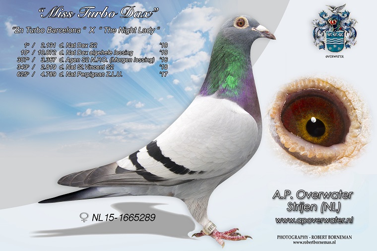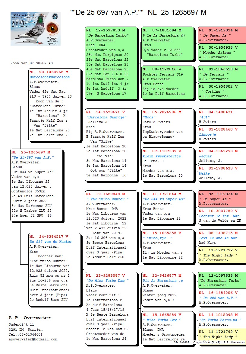 Uit: ”Barcelona x Barcelona”, zoon ”De Barcelona Turbo”, 1. Int. Asduif Barcelona, uit 1/2 zus ”Silke”, 1. Nat. Barcelona x ”De 517 van de Hunter”, dochter ”The Turbo Hunter”, 1. Nat. Libourne 12.023 d.