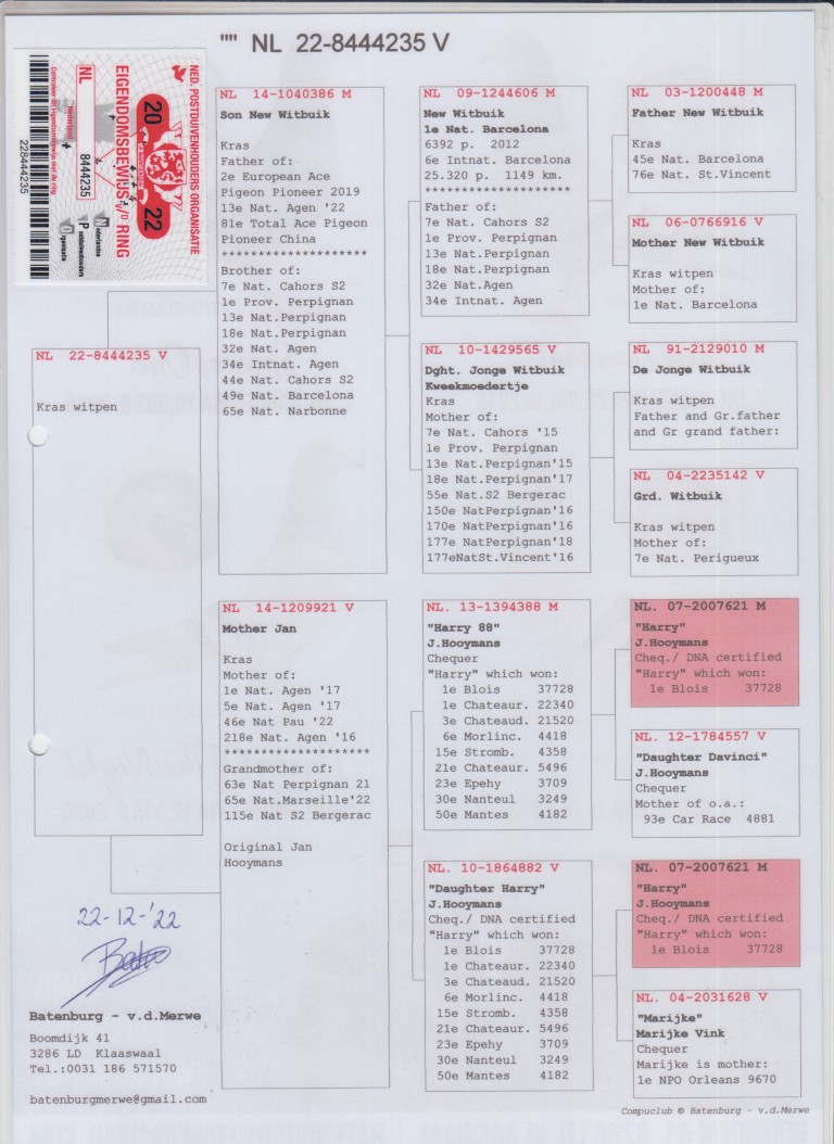 (1/2) zus 1. Nat. Agen, 2. Europese Asduif Pioneer Club, 5. Nat. Agen, 13. Nat. Agen, uit: ”Son New Witbuik”, zoon ”New Witbuik”, 1. Nat. Barcelona 6.392 d. x ”Mother Jan”, uit zoon & dochter ”Harry”, 1. Nat. Asduif Dagfond WHZB